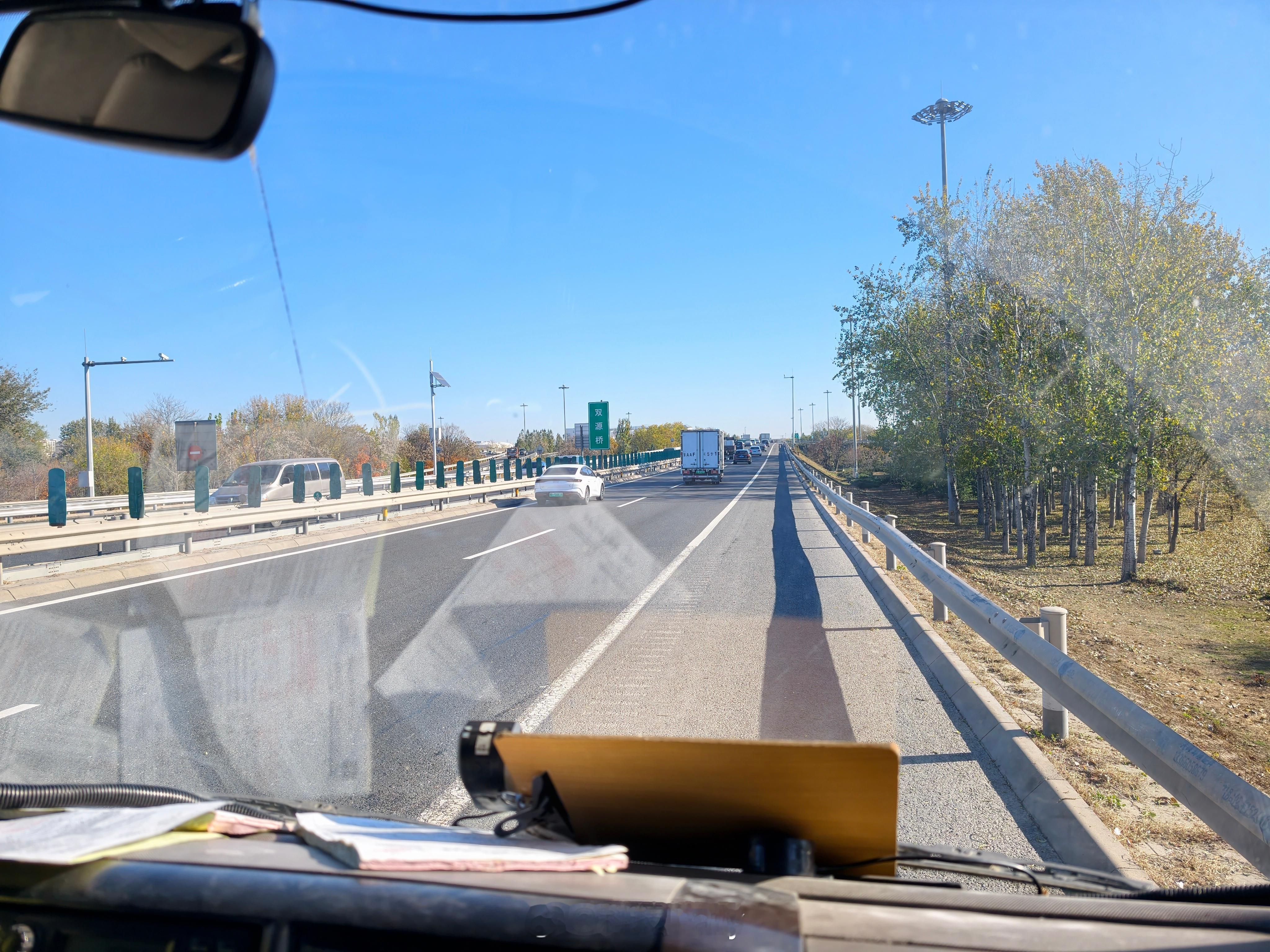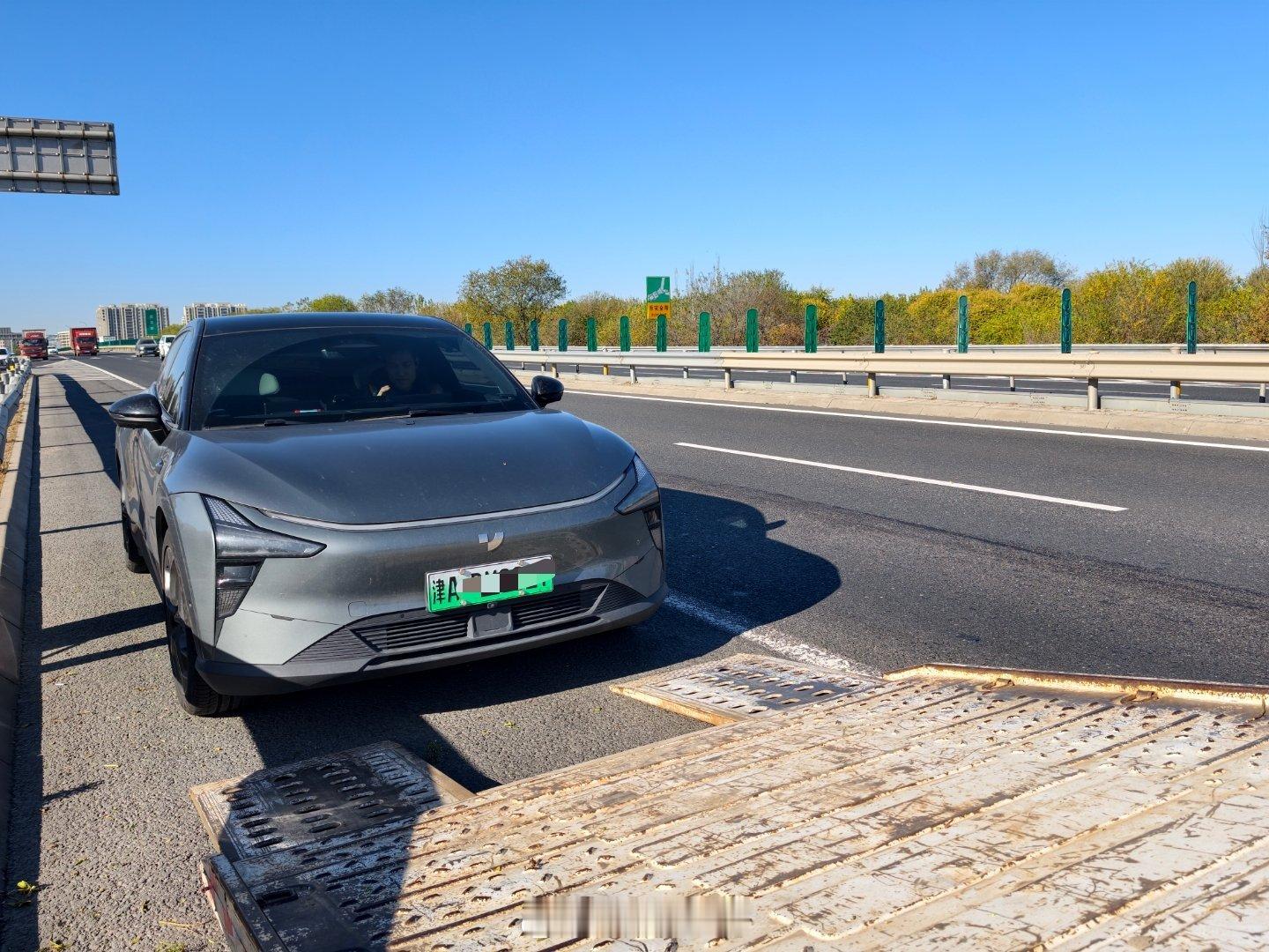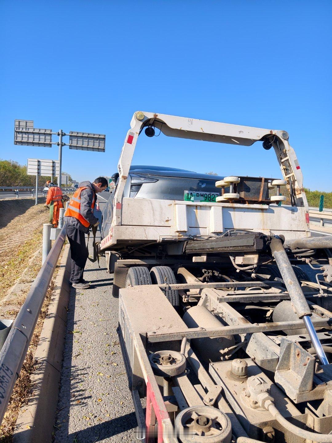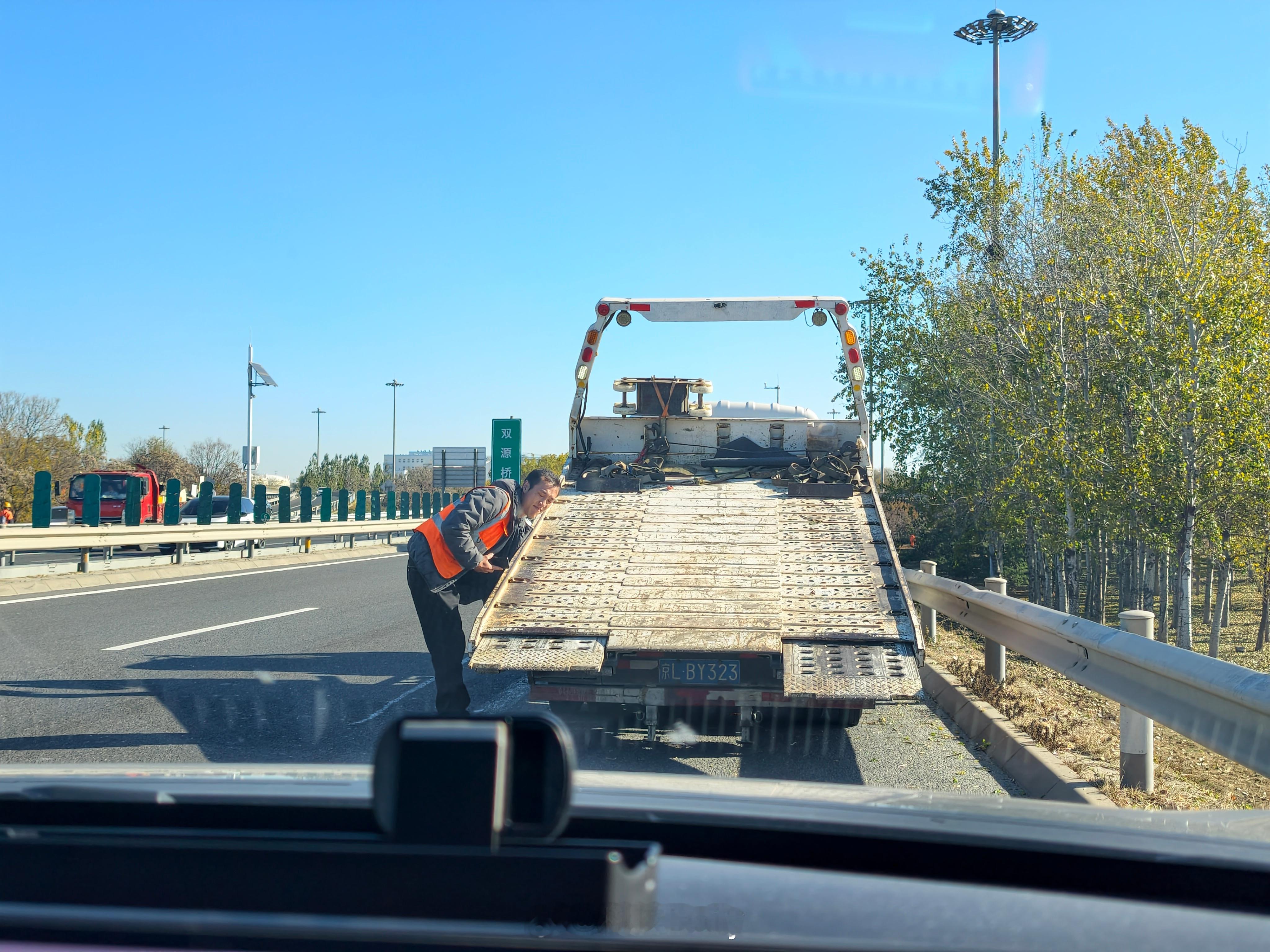 咱也是坐上高速救援车了,保险公司靠谱有免费救援,就近拖到拖车店去修吧。没想到在北京六环路上,也能爆胎真离谱,幸好速度比较慢没啥问题。这路段应该是首发养护负责,看看后续咋整吧,先送修赶飞机。