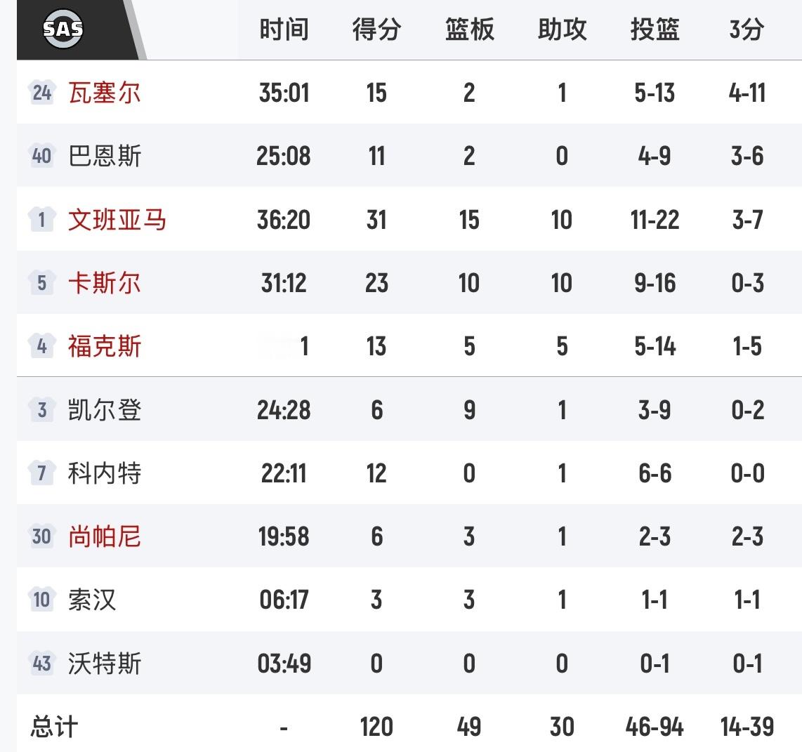 马刺末节崩盘!勇士终结客场6连败!库里44分5篮板5助攻,投篮25中13,三分16中5。格林6犯毕业,得到6分5篮板4助攻,投篮10中1,三分7中0文班31分15篮板10助攻,卡斯尔23分10篮板10助攻。文班亚马是真想赢,拼到最后!