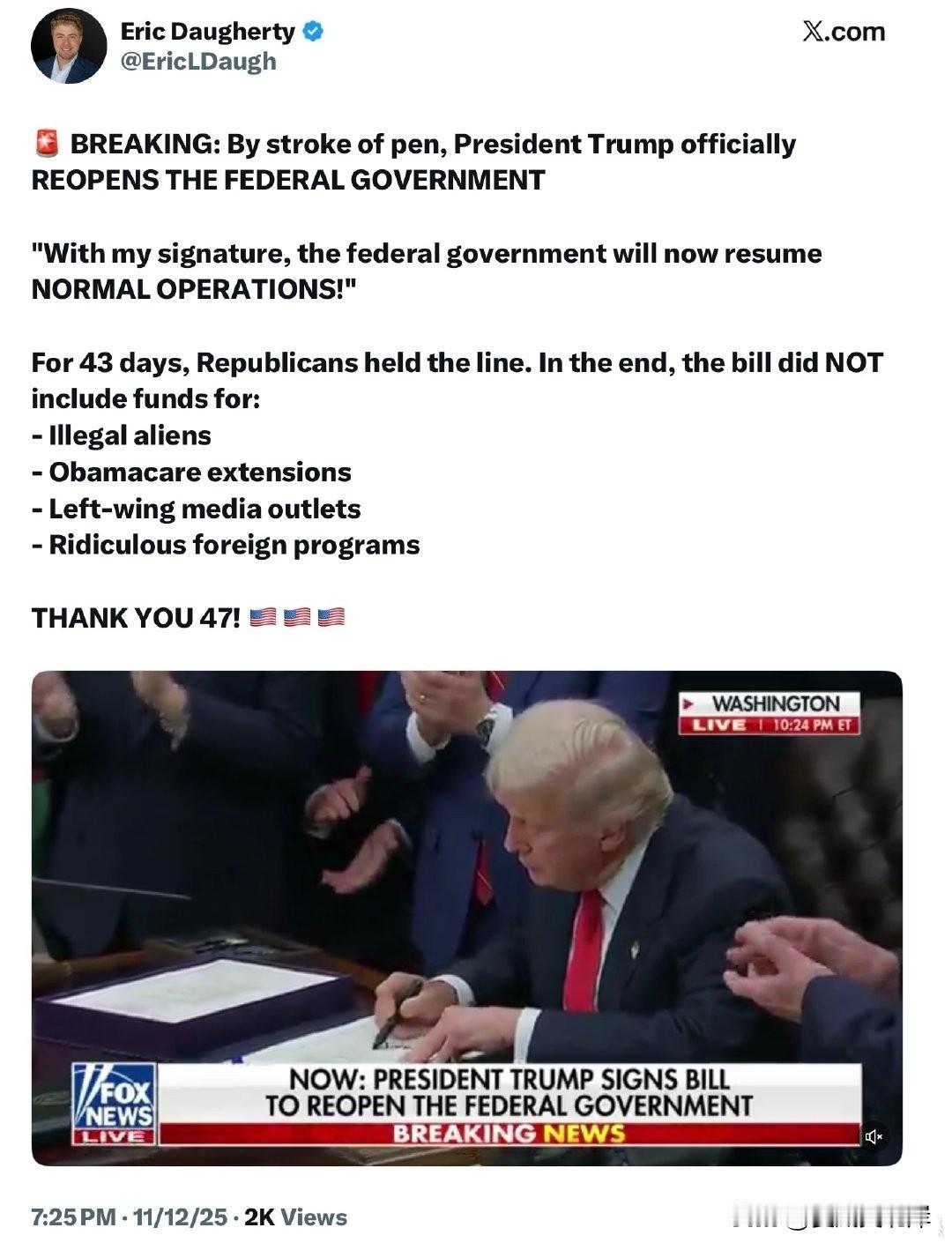 突发新闻:川普总统大笔一挥,正式宣布 重新开放联邦政府! “随着我签署这项法案,联邦政府将恢复正常运作!” 在过去的43天里,共和党人坚守立场。最终通过的法案没有包括以下资金: - 非法移民 - 奥巴马医保扩展 - 左翼媒体机构 - 荒谬的海外项目 感谢47!