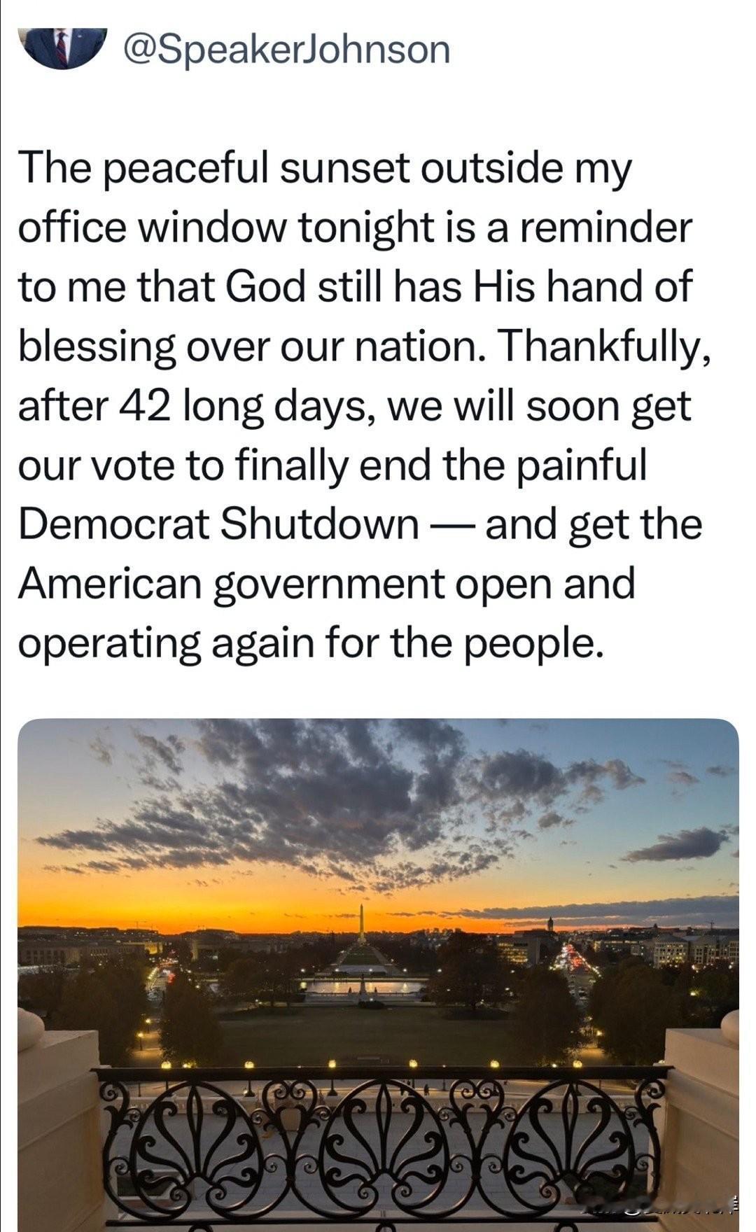 众议长Mike Johnson发文称政府即将重启。 “我办公室窗外宁静的日落提醒我: 上帝依然庇佑着我们的国家。 谢天谢地,经过42个漫长的日夜, 我们即将投票,终于结束民主党人造成的痛苦停摆, 让美国政府重新为人民开放、运转起来。”