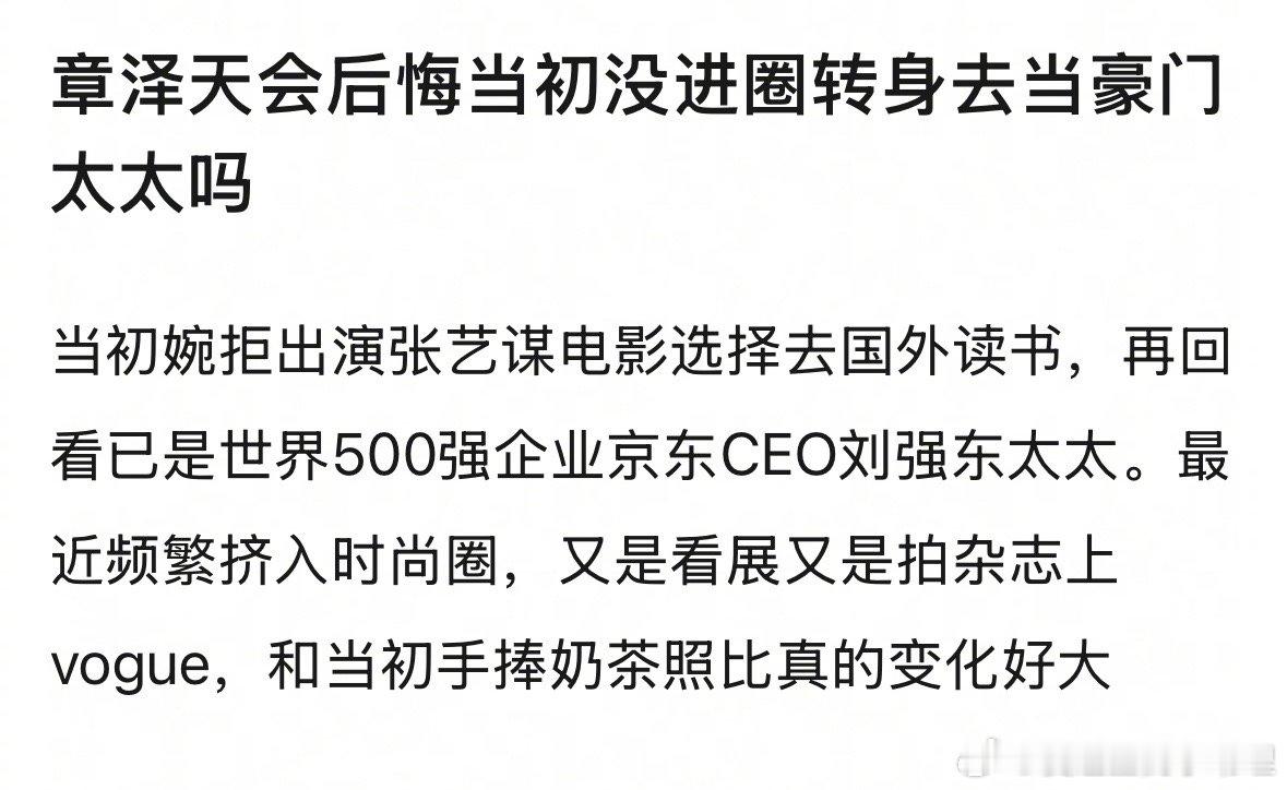 郫县热议:章泽天会后悔当初没进圈转身去当豪门太太吗?