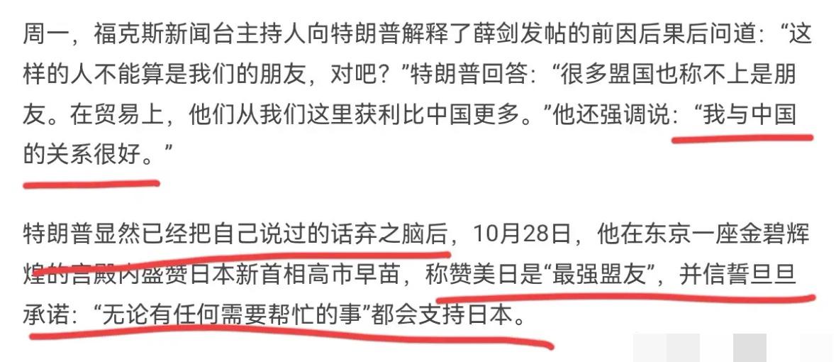 法媒感到很泄气!法媒表示,美国显然已经把其盛赞的美日是“最强盟友”的讲话,抛在了一边! 法新社刊文表示,10月28日,特朗普称赞美日是“最强盟友”,并信誓旦旦承诺:“无论有任何需要帮忙的事”都会支持日本。 然而,面对中日纠纷,特朗普却冷淡的表示,我与中国的关系很好。不仅如此,法媒还注意到,特朗普还对将接受60万中国留学生进行辩护 法媒不高兴的背后原因,都没有讲。特朗普采访中表达的意思是,如果把中国换上法国学生也好不到哪去,还不如中国学生。不管是今天的世界,还是明天的世界,实力最关键。美国特朗普,知道中国有实力,中美关系处理好了,比任何国家都重要。 在之前,中国驻大阪总领事,强烈警告日本之后,许多日本网纷纷叫嚣着要将中国外交官驱逐出境。 然而在美国总统特朗普针对这一情况进行表态之后,日本网民居然改变了风向,居然对日本首相高市早苗进行了新一轮的批评。