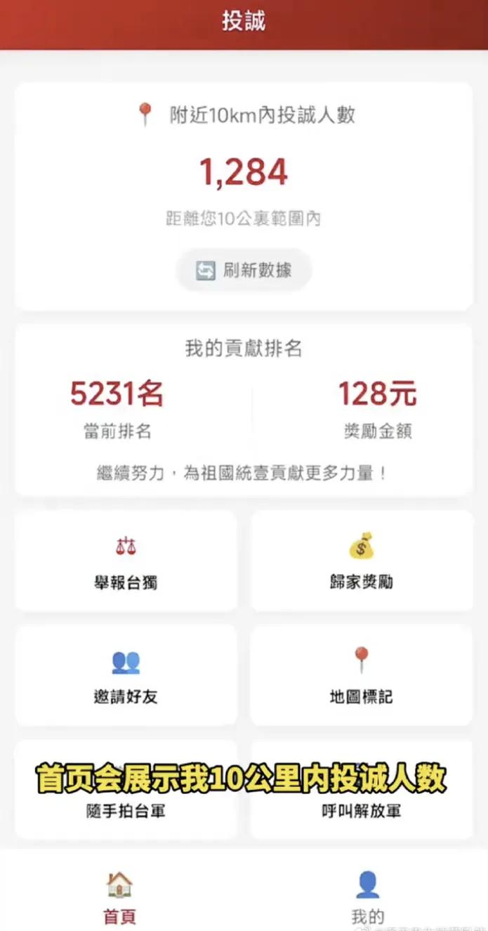 这APP功能很全面啊,虽然是娱乐化的,但很有意思。 这APP以“一键登记投诚祖国”为核心卖点,用户注册后可获得大陆身份预留、还有福利兑换 如鸡蛋、牛奶、旅游券等等。 还可以线上实时统计投诚人数。还设计了“台独举报”“台军动态随手拍”等模块,用户上传相关证据可累积“爱国积分”,兑换物资或解锁排行榜排名。