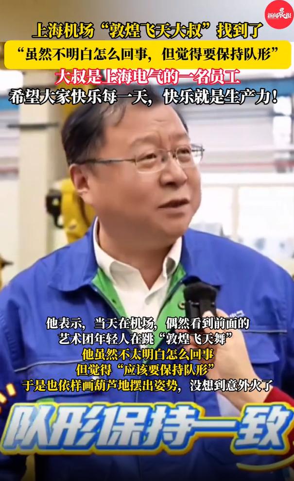 后续!火遍全网的误入上海机场“敦煌飞天团”大叔终于找到!“虽然不理解,但是队形必须保持一致”,大叔一句话成梗,太可爱了! 早上突然刷到这条视频,点开一看乐得不行! 几名身形妖娆的年轻人,在机场传送带上做出舞蹈动作,结果吊车尾的居然是个胖胖大叔? 别看大叔年纪大,体型也发福,人家愣是脸不红比不同,跟着前面的小年轻做出动作,好家伙,队伍整齐划一,队形完美一致…… 视频在网络上发布之后,网友们立刻被这名“误入视频”的可爱大叔吸引,纷纷表示要把“路人甲”给找出来哦! 这事是这么个起因: 10月31日下午,云南一家艺术团受邀来上海表演,一群年轻舞蹈者们在机场时心血来潮,决定站在传送带上拍一个“飞天造型”的视频…… 这名胖胖的大叔姓傅,是上海电气下属企业上海电机厂的老员工,当天他正好也和同事在外地参加完会议乘机回上海。 傅师傅回忆,站在传送带上,他一抬头发现前面几个年轻人突然做出类似飞天造型的动作,他想也没想,脑子里只有一句话:“虽然不理解,但是队形必须一致”! 傅师傅立刻抬起手也做出一个动作……这就是红边网络视频的由来了。 瞧瞧视频里的傅师傅,圆乎乎的身子,可爱的脸,但是一本正经的配合做着动作…… 傅师傅今年已经54岁,但是他说自己心态很年轻,平时喜欢和年轻人相处,“我觉得很有趣,被氛围感染后就加入了,就像网友们说的,‘不理解但照做’。”傅师傅这样说! 上周六的时候,有同事神秘兮兮的拿着视频来问傅师傅——这上面是不是你?你要火啦! 此时的可爱大叔才知道,自己不经意的一个动作,居然逗乐了万千网友,也顺带让自己成了网络红人! 别看那个动作小,真要是遇到心态不好,或者天生严肃的人,是绝对不可能配合“队伍一致”的!所以,54岁的傅师傅一定有着“有趣的灵魂”,是一个“宝藏大叔”…… 如今,评论区许多云南地区的网友热情洋溢邀请傅师傅过去玩,还有人羡慕傅师傅的家人,有这样一个有趣的丈夫、父亲,这个家庭一定很幸福! 笔者也突然发现,其实快乐真的很简单,生活中处处都能让你开心,只要你善于发现和关注……