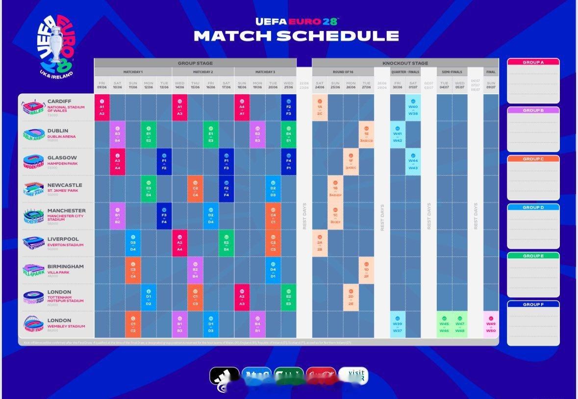 【2028欧洲杯决赛地点确认】由两国四地(英格兰、苏格兰、威尔士、爱尔兰)合办的,比赛的赛程和承办球场正式公布。开幕式和揭幕战将于2028年6月9日在威尔士卡迪夫千禧球场举行,决赛则是7月9日在伦敦温布利球场。2028欧洲杯,一共有9座球场承办比赛:千禧球场(卡迪夫)、都柏林竞技场(都柏林)、汉普顿公园球场(格拉斯哥)、圣詹姆斯公园(纽卡斯尔)、曼彻斯特城市球场(曼彻斯特)、埃弗顿体育场(利物浦)、维拉公园球场(伯明翰)、托特纳姆热刺球场(伦敦)、温布利球场(伦敦)。PS:欧足联规定,欧洲杯举办球场,整个赛事期间不能使用商业冠名。