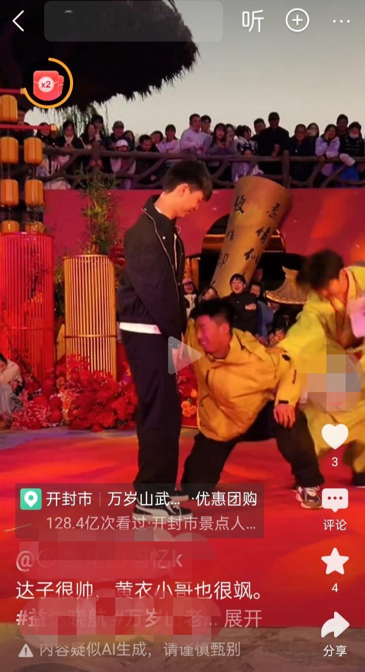 如今万岁山武侠城的斗舞还值得一看吗?主持人换成了一个自称“老嫂子”的男性,听他讲话就让人不适。舞台上变成了男人之间的互动,一个对着另一个卖弄风情,还不时有亲昵举动,看着着实怪异。这种表演形式用低俗、庸俗、媚俗、恶俗来形容毫不为过。这里是公众场合,并非娱乐场所,搞这种擦边表演真的妥当吗?图片为视频截图。
