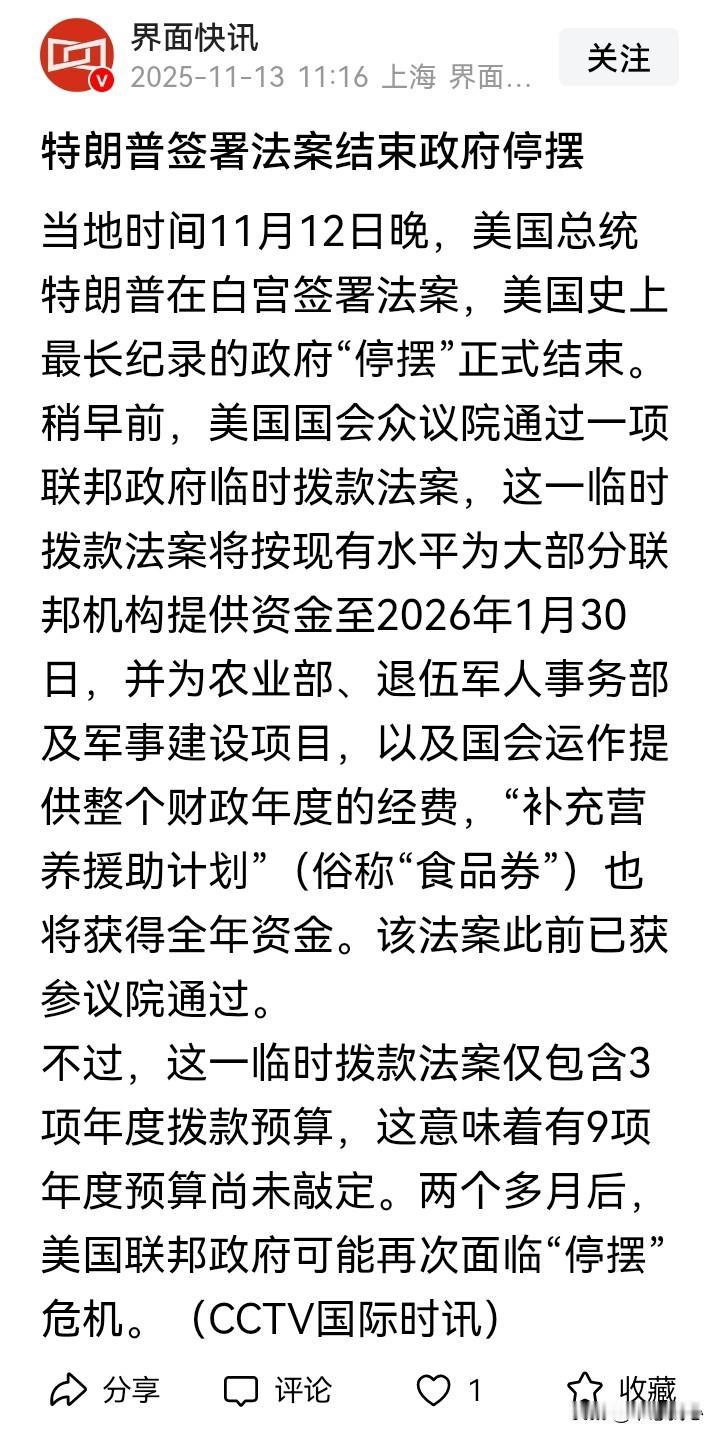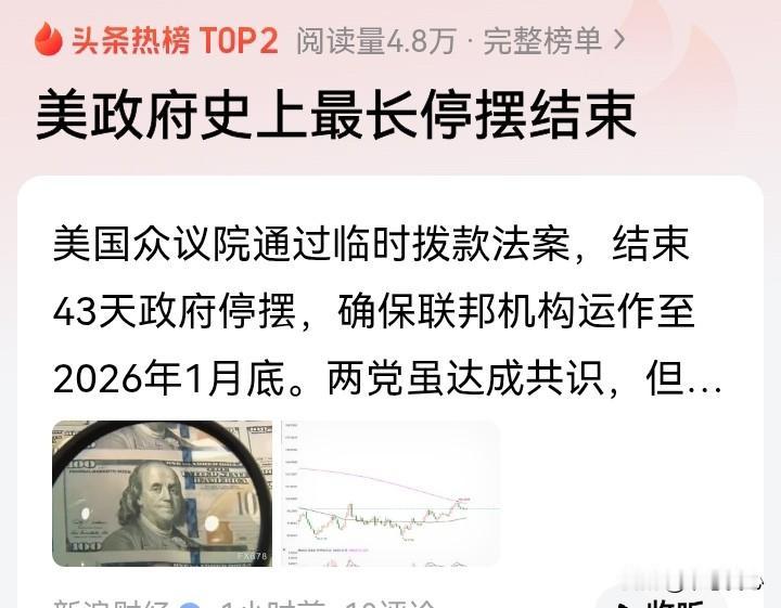 我把话撂在这了,美国政府再关门停摆,倒计时78天开始了…… 此次美国联邦政府停摆43天,已经成功打破了2018年年底至2019年年初停摆35天的历史纪录。而其实,这两次停摆,总统都是特朗普! 此前,美国政府停摆也出现过十多次,分别是上世纪80年代的8次,绝大多数仅持续1-3天;上世纪90年代的3次,最长持续21天;2010年以来出现过4次,时间持续很久,比如2018年底的35天,今年2025年的43天! 至于明年2026年1月底后,会否再次停摆,再创时间记录,就让世界拭目以待吧。 美国政府因为没有资金维持运转,以至于停摆了。但是,你要说美国政府没有钱吧,又不对,因为他们只要开动印钞机就行了,毕竟凭着美元霸主地位,全世界都在为他们买单…… 他们没有钱,是因为两派之间的斗争,不肯继续拨款来维持政府的运转。 此次,就是因美国两派在医保等相关福利支出方面存在分歧,美国国会参议院未能在9月30日上一财年结束前通过新的临时拨款法案,才导致的停摆。 直至11月10日修改版的临时拨款法案获得通过前,他们累计进行了14次表决,均因两派之间的分歧而未获通过。 此次,虽然涉险过关,但是两派之间关于医保等领域的分歧依然存在,暂时的妥协,在这倒计时的78天内,假如还是解决不了利益分歧,那么,美国再次迎来停摆也就不奇怪了……