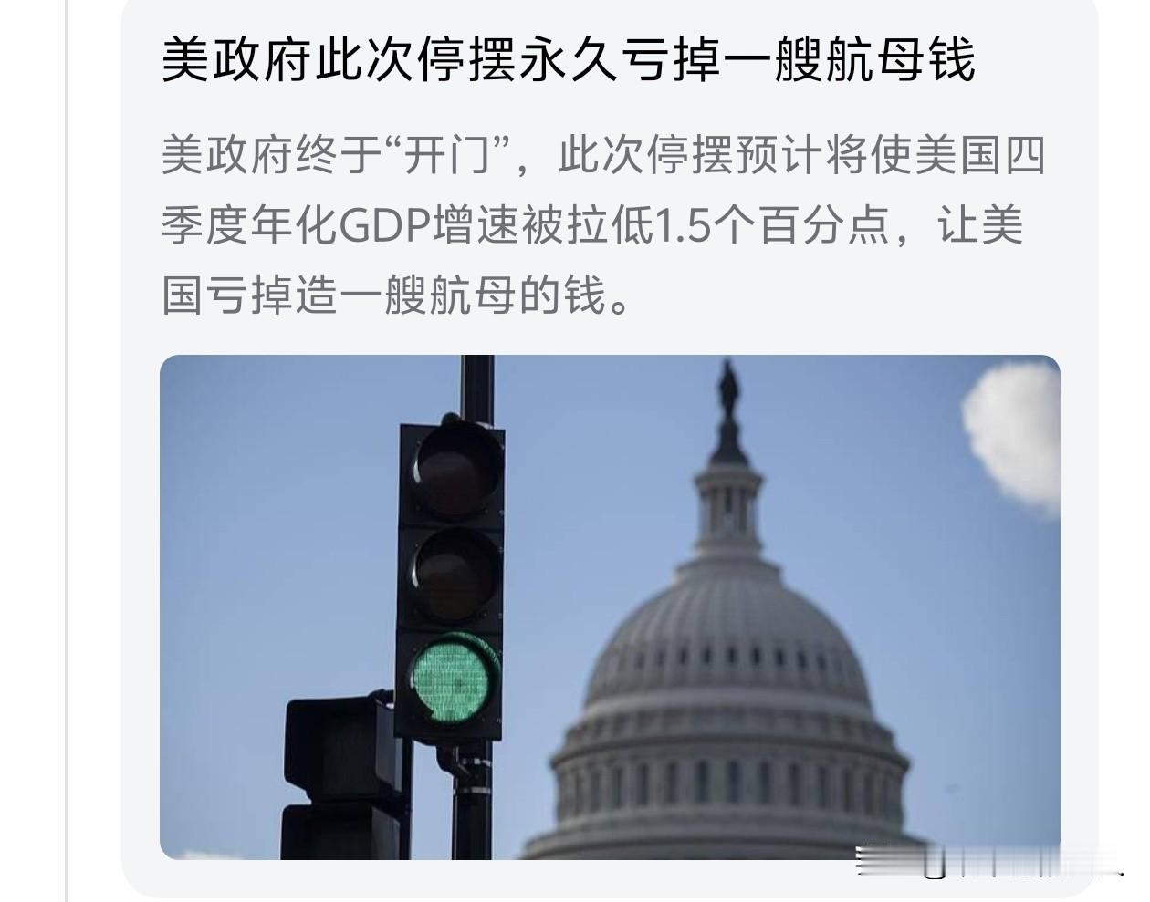 哇塞,堂堂的世界强国,今天开门营业了,你看白宫政府把“停摆”损失的账都算出来了,一个月亏了一艘航母。 其实,这民主党,还是不够狠,你要给他停一个月太短了,给共和党停个一年,你看看,12艘航母没了后,特朗普不下台也得下台。