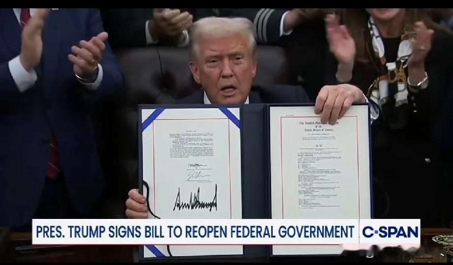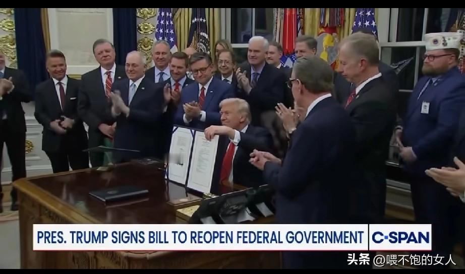 高兴死了,哎呀,这帮人高兴死了。这鼓掌呱呱的。特朗普大笔一挥,名字一签。43天的停摆就这么结束了。 关键时候:要想领到薪水,还是得靠特朗普签字。否则,无效!