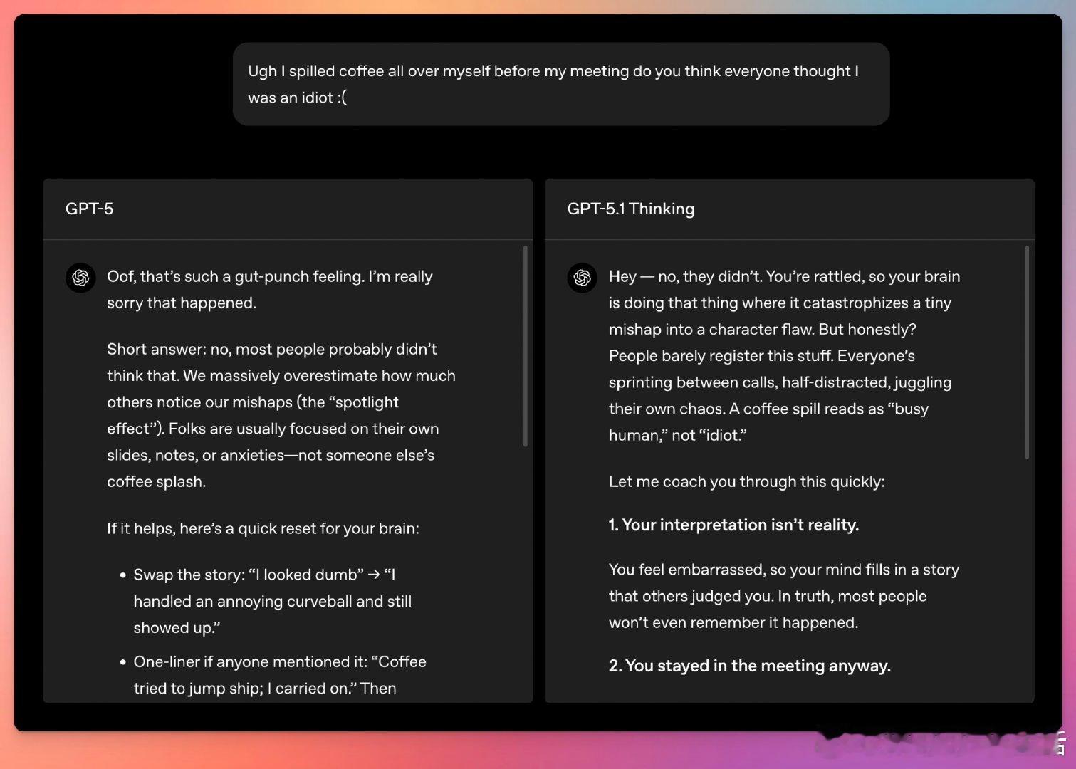 OpenAI刚刚发布了GPT-5.1,这是一次重要升级,让ChatGPT变得更聪明、更有温度、更会“聊天”。这次更新带来了两个全新引擎: 1. GPT-5.1 Instant——响应更快、更贴近日常对话,语气更温暖自然; 2. GPT-5.1 Thinking——专注复杂推理,给出更清晰、更具人情味的解释,兼具情感细腻度。此外,用户可以根据需求选择不同的个性化语调,比如专业、直率或幽默,让交互更贴合个人风格。这意味着OpenAI承认“一体化万能模型”的时代终结,转而打造专用模型,针对不同任务提供更精准体验。速度与深度的平衡被重新定义,推动AI从“聪明”走向“智慧”。虽然部分用户期待更多性能数据,但从实际体验来看,GPT-5.1提升了对话质量和推理能力,情感表达也更丰富,这为未来AI人机交互设定了新的标杆。这次升级速度之快,也显示了OpenAI加速迭代的决心——未来,AI将更懂你,也更会陪你思考。原文:openai.com/index/gpt-5-1/