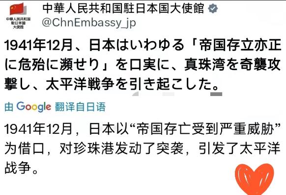 今天,驻日大使馆,官方发布了一条推文:其中,有一句话,就能够让日本政界彻底闭嘴,不寒而栗。 不久前,日本右翼代表高市早苗抛出一句颇为刺耳的话——如果不具备所谓的“反制能力”,日本的存亡将面临严峻挑战。 这样的话听上去像是站在国家利益的制高点,却有着明显的历史影子,七十多年前,1941年12月,日本当局也用过几乎一样的说法。 当时,他们称国家到了生死关头,随后便发动了珍珠港袭击,将战火直接引向美国,太平洋战争就此全面爆发,日本的军国主义狂热也推向顶点。 这一次,中国驻日大使馆的推文,只用一段事实陈述,就把高市早苗的言论和当年的历史直接挂钩,没有长篇批评,也不带情绪化,说的只是历史发生过的事实。 但这种做法杀伤力极高——任何人看到这条推文,都会想到那段血的教训,对于日本,这是一记警钟;对于美国,这则是提醒他们不要忘记曾经的遭遇。 珍珠港在美国历史中是无法忘记的画面,那是一道至今都无法抹去的伤痕,袭击当天,美国从孤立主义立刻转向全面参战,“记住珍珠港”成为全国动员的口号。 如今,中国在推文中提及此事,等于是刺中了美国的神经,让华盛顿不得不重新审视日本右翼的动向,毕竟,曾经的盟友也可能再次变成风险来源。 “存亡危机”这一套说辞,在日本历史上有着明确的功能——用危机情绪煽动民意,把军事扩张包装成自我防卫,高市早苗的发言,与其说是出于安全需要,不如说是为冲破战后宪法限制找借口。 所谓“反制能力”,在他们的逻辑里,不是单纯防御,而可能发展成主动打击的权力,一旦这个边界被突破,东亚的安全平衡必将受到冲击。 这也是为什么中国大使馆的回应,显得格外精准,通过历史对照,不仅是在提醒日本不要忘记自己曾经的道路,更是在告诉世界,中国对任何形式的军国主义复辟保持高度警惕。 目前,局势还在发展。日本右翼是否会因此收敛,美国是否会调整对日政策,都是未知数。但可以肯定的是,这场由一句“存亡危机”点燃的博弈,已经不只是中日之间的事情,而是牵动东亚格局的关键节点。