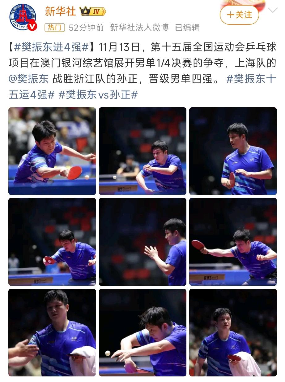 樊振东这状态真是挡不住啊。 刚在澳门打完的四分之一决赛,直接4比0把浙江的孙正给送走了,连打两场一局没丢。 反手拧拉压得对手没脾气,多拍相持关键分还稳得离谱,得分率超过九成,这还怎么打? 其实前面几轮就看得出他手感热得发烫。从十六强开始,对周雨4比0,到八强打薛飞也就丢了一局,第四局稍微晃神一下立马就调整回来。 难怪网友调侃,看他打球像看精密仪器运转,连汗都滴得很有节奏。 要说这背后真不是偶然。听说他赛前减了20斤,移动速度、击球质量全上来了,刚下飞机就扎进训练场。 更关键的是心态,人家张口闭口“轻装上阵”,不纠结结果,只专注每一分——这种松弛感,可是从德甲联赛到封闭训练一点点磨出来的。 如今他手里已经握着全运五金,再赢一场就能冲第六块,延续巴黎奥运那股“超级全满贯”的势头。 半决赛对手可能是林诗栋或赵子豪,不管是谁,樊振东要做的还是老样子:压住节奏、别轻敌、把反手优势打透。 从八一队解散后的低谷,到巴黎奥运逆转张本的经典战,再到现在云淡风轻连赢八局——这人哪,真是把进化俩字写进了骨子里。