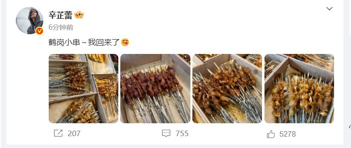 烟火气才是顶流!辛芷蕾晒小串满是乡愁,真实又亲切,太有感染力~