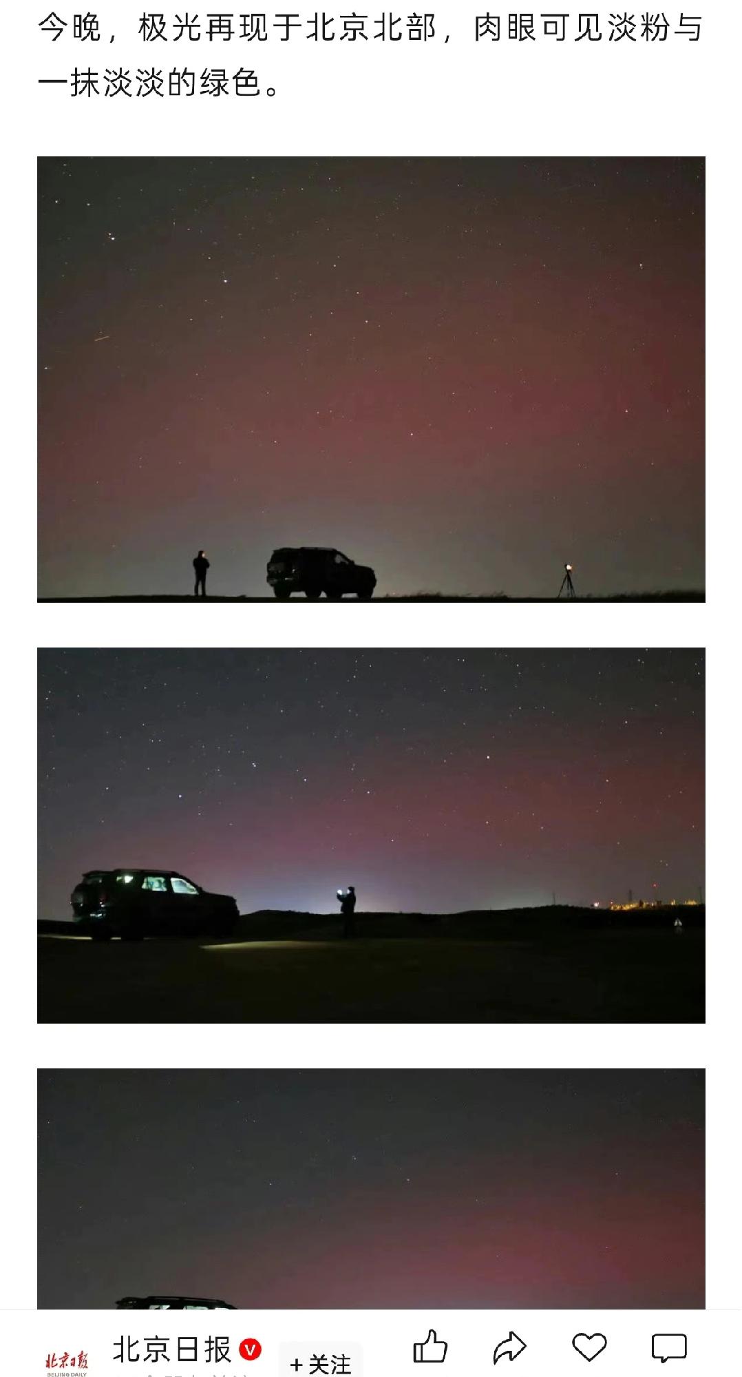 北京出现极光! 北京极光 受地磁暴影响,北京北部地区出现了极光,同时除了北京之外,北纬40°以北地区、天气晴朗、能见度好的地方,都有机会见到,尤其内蒙古、新疆、黑龙江靠北地区,会看得更清晰! 这真的是非常好的机会,毕竟以前看想看极光得靠近北极圈,现在受地磁暴的影响,极光覆盖的范围更大的。 各位是怎么看的?欢迎评论区留言。