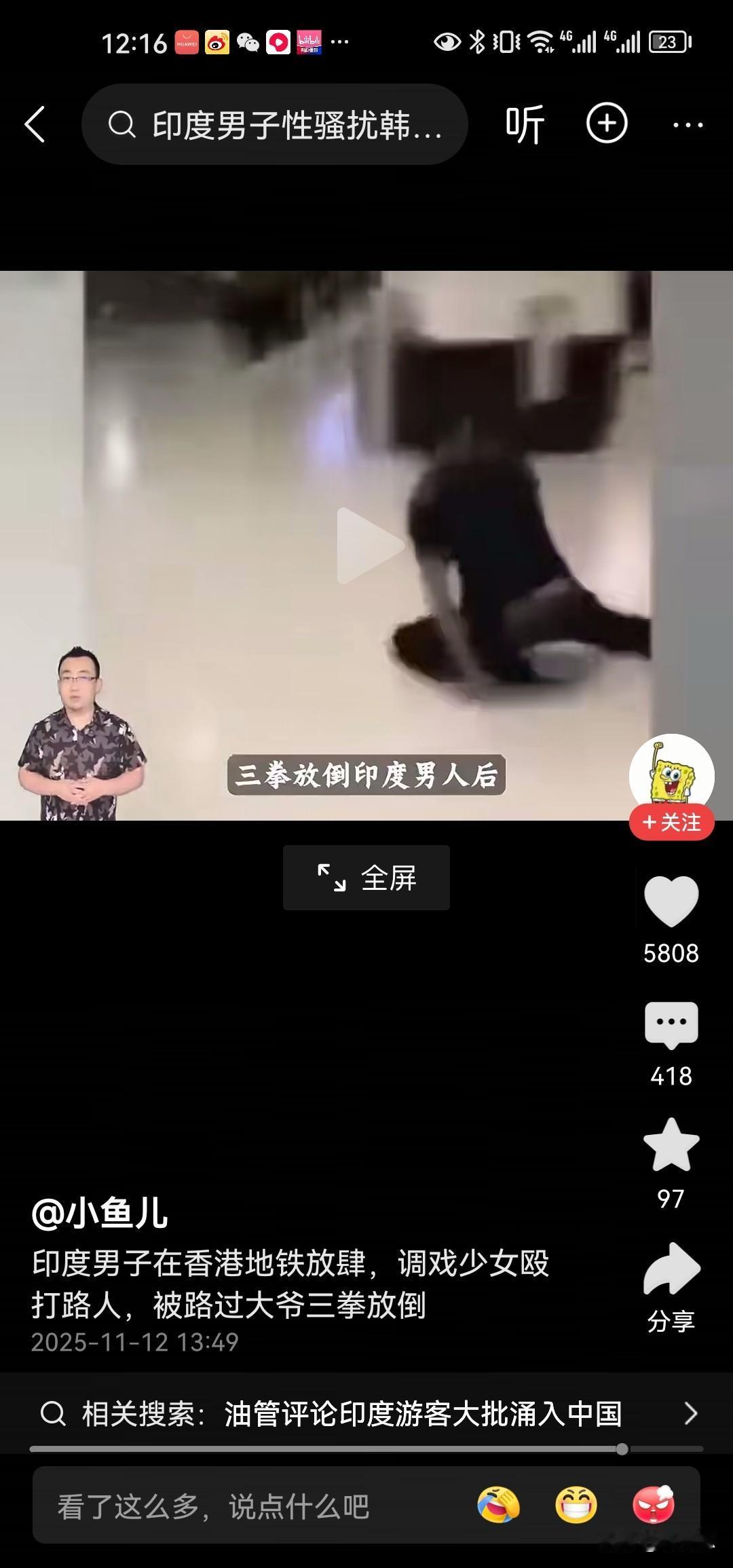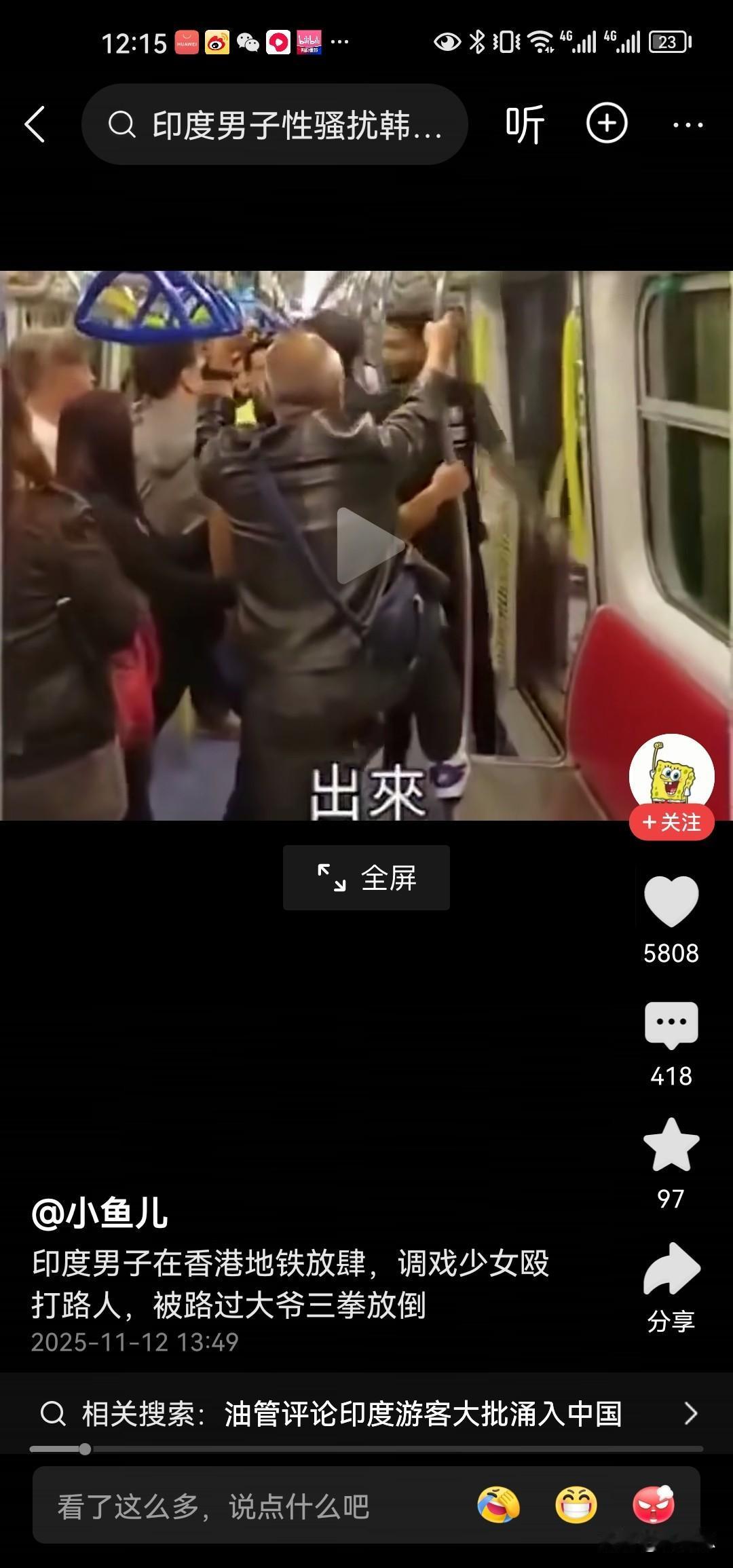 你看,印度人就这么嚣张,三名印度人在香港喝醉了,在地铁里调戏一名少女,香港人没有惯着他,对他拳打脚踢,狠狠的教训他们,他以为香港是他们印度,是他们西方的地盘。点赞👍中国香港人有血性,当然我们也要赞扬当地的法警是正规的,试想一下,如果印度人在内地如此行为,我们该如何处理?我们有人会挺身而出吗?我们当地的会维护正义还是外人为大?无论是谁在中国的地盘欺负中国人,必须要得到应有的惩罚,最好应该驱逐出境。