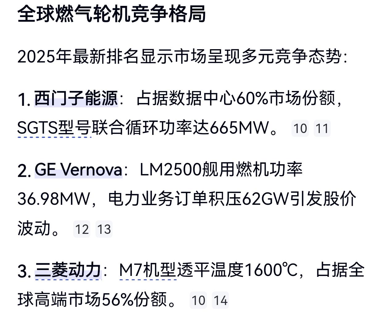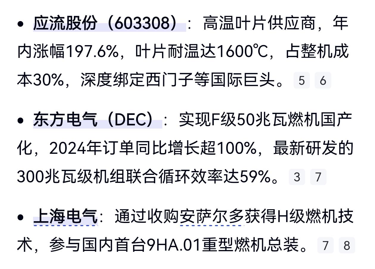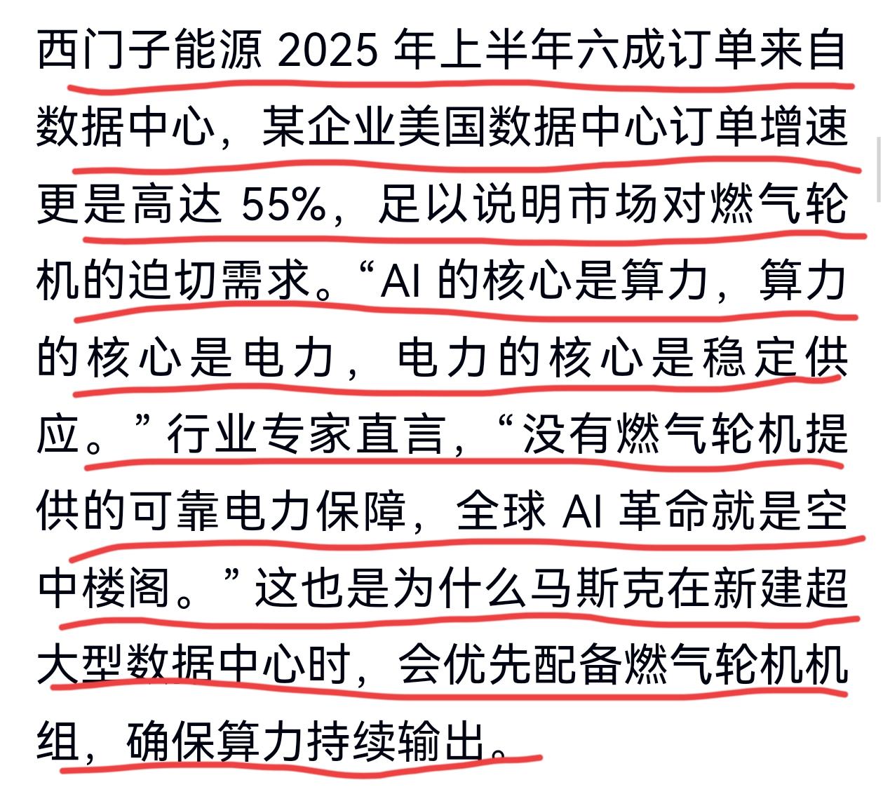 数据中心电源轮到燃气轮机了。AI数据中心引爆燃气轮机需求,GE、西门子的订单排在了2028年,三菱计划两年内产能翻番都跟不上需求,供不应求还直接导致产品提价,重型燃机比2023年贵了15%—20%,核心部件涨幅更夸张;交货期也延长了,从18个月拉长到27个月,最长的得等5—7年。 AI数据中心的大规模建设,对电力提出了迫切需求,电力的核心是稳定供应,AI电源必须零中断、高稳定,还要考虑双碳目标的限制。核电当然是首选,但核电规划建设周期长,远水不解近渴;储能变成现实的选择,可以充分利用现有装机容量,但现有装机和电网冗余有限;燃气轮机、固体氧化物燃料电池就成了优先选择,因为燃气轮机启动只要10分钟,联合循环燃气轮机的热效率超过64%,还能快速响应负荷变化。马斯克在建设超大数据中心时就优先配备燃气轮机组,确保算力持续输出。燃气轮机叠加需求还有欧洲用燃气轮机替代煤电机组、早期燃气轮机组退役替代旺盛,这使得供求失衡更加严重。 燃气轮机需求扩张,燃气轮机行业的好日子到了。国际巨头是GE、西门子、三菱,订单多到做不完,国内的应流XX、派克XX等企业进入了这些巨头的供应链,作为关键零部件供应商订单也不会少;国内头部整机厂还是三大动力装备基地,东方电气、上海电气、哈尔滨电气,订单也是排满了。尤其是东方电气,在F级、H级燃机领域全域突破,G15H纯氢燃气轮机实现了零碳燃烧突破。纯氢燃气轮机是最终目标,投资低、零排放、响应快,可与氢能储存系统联动,解决可再生能源波动的难题。 大厂的订单排到2028了,燃气轮机产业景气周期至少到2028年之后,A股相关概念已有所表现,但放长远一些来看,现在也只是初期。