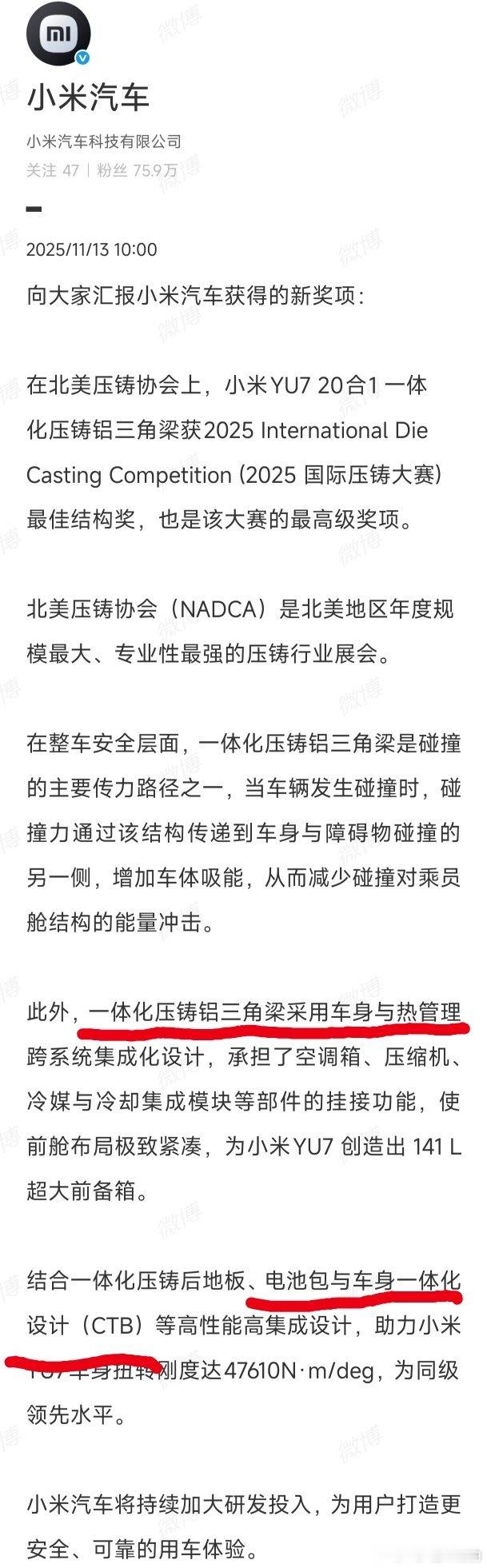 看看,CTB成了获奖的重要原因了还有人说小米SU7没底盘了吗?CTB技术是一项利远大于弊的综合性工程突破。它通过高度集成化的设计,为你带来了更长的续航、更宽裕的空间、更安全的车身和更富乐趣的操控,是一起品牌技术实力的集中体现。