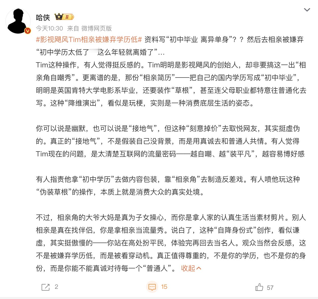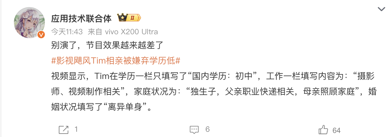如果完整的看影视飓风QA视频并明白什么叫「整活」那就能理解Tim这段相亲视频的本意是搞笑包括学历、家庭背景都是图一乐的素材罢了可惜如果只是看这个话题和视频片段并且刻意曲解 是为了消费底层未免有点带节奏和刻意希望别人翻车了只能说传统媒体已经无事可做不是造热搜,就是标题党
