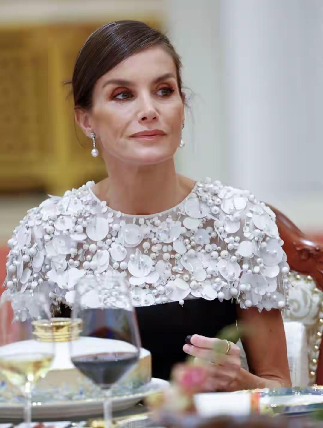 西班牙王后北京国宴的“大招”也太接地气了!53岁穿黑白亮片裙配盘发惊艳全场,看着
