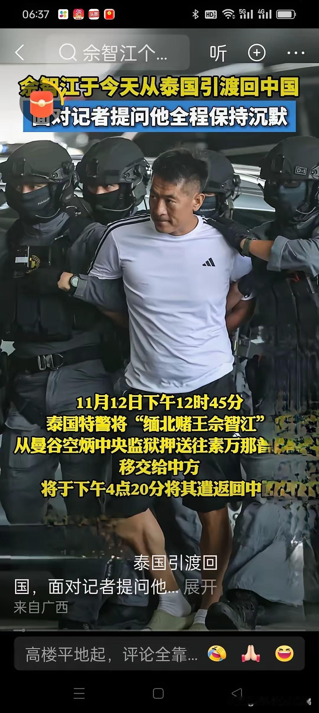 不是不报,时候未到! 佘智江11月12日从泰国引渡回国,面对记者提问,全程保持沉默。 佘智江,又名佘伦凯,男,1982年出生于湖南省邵阳市,后获柬埔寨国籍,跨国犯罪集团的头目,缅甸KK园区的重要控制者之一。 据网友爆料,此人可能是十几年前爆红的某女星的表弟,此次深挖可能会有大瓜。 麻烦看官老爷们右上角点击一下“关注”,既方便您进行讨论和分享,又能给您带来不一样的参与感,感谢您的支持!