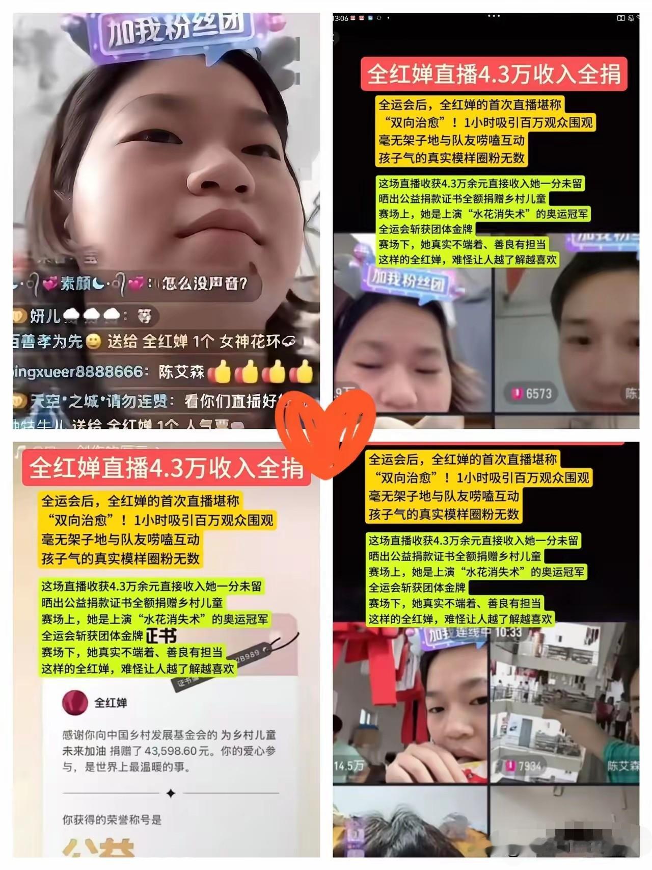 谁懂啊? 全红婵的第一次直播带货就引发了网友们的无限热潮!在线人数一下子就突破了10万,而且礼物刷屏不停,直播间里的各种礼物根本停不下来!为了感谢支持她的人,红婵是夸张地鞠躬好几下,感谢的话说了一句又一句,感谢的姿势做了一遍又一遍,十分搞笑!可爱极了! 最可爱的是她的队友们也跟着她一起直播,他们用稚嫩的声音说着不太流利的普通话介绍各自的拿手特产,还好奇地学习着怎么用手机直播,真的是可爱到爆炸了!全红婵的直播间里满满都是温暖和正能量!直播中红婵不断地介绍着自己的产品,同时也不忘宣传自己的全运会,让大家关注除了跳水以外的其他运动项目! 更让人感动的是,她表示自己赚取的所有收入都捐给公益,不赚一分钱,真的很高格局了!网友们纷纷表示被她圈粉,当然也有很多人想冲她再看一次直播,但可惜的是没有下次了。满屏都是礼物和暖心话语,还有可爱的队友和搞笑的红婵,这就是她的第一次直播带货,完美收官! 麻烦看官老爷们右上角点击一下“关注”,既方便您进行讨论和分享,又能给您带来不一样的参与感,感谢您的支持!全红婵勇夺冠 跳水冠军婵