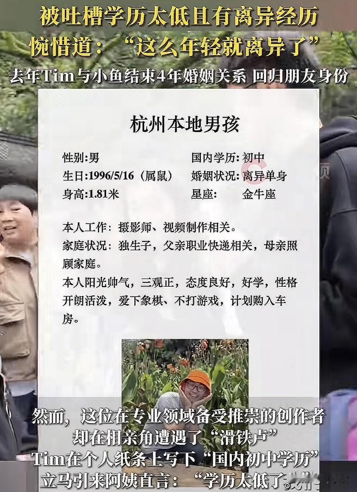 终于知道为什么了, 影视飓风的ceo去相亲频频被拒绝, 不是因为他的简历造假,也不是因为他的条件太差了,而是家长们压根不了解他。 近日影视飓风ceo的tim去相亲,本以为最起码能被一两个家长看上,没想到,家长一看到他的简历立马不给机会了。 他简历上写着国内学历初中,事实上他是在国内读初中,然后外国留学,他本人也确实是摄影师,但是是一家大公司的ceo,而父亲从事快递行业工作,也没错,是圆通的一个大老板,最真实的就是离异了。 而这些信息被家长们看到,立马就觉得这男生条件太差了,甚至连攀谈的机会都没有。 但凡有一个家长细问,tim估计就露馅了,比如问年收入,奈何这简历的条件太差了不仅没有家长看上,还被家长吐槽没有实力。 对此,您怎么看呢