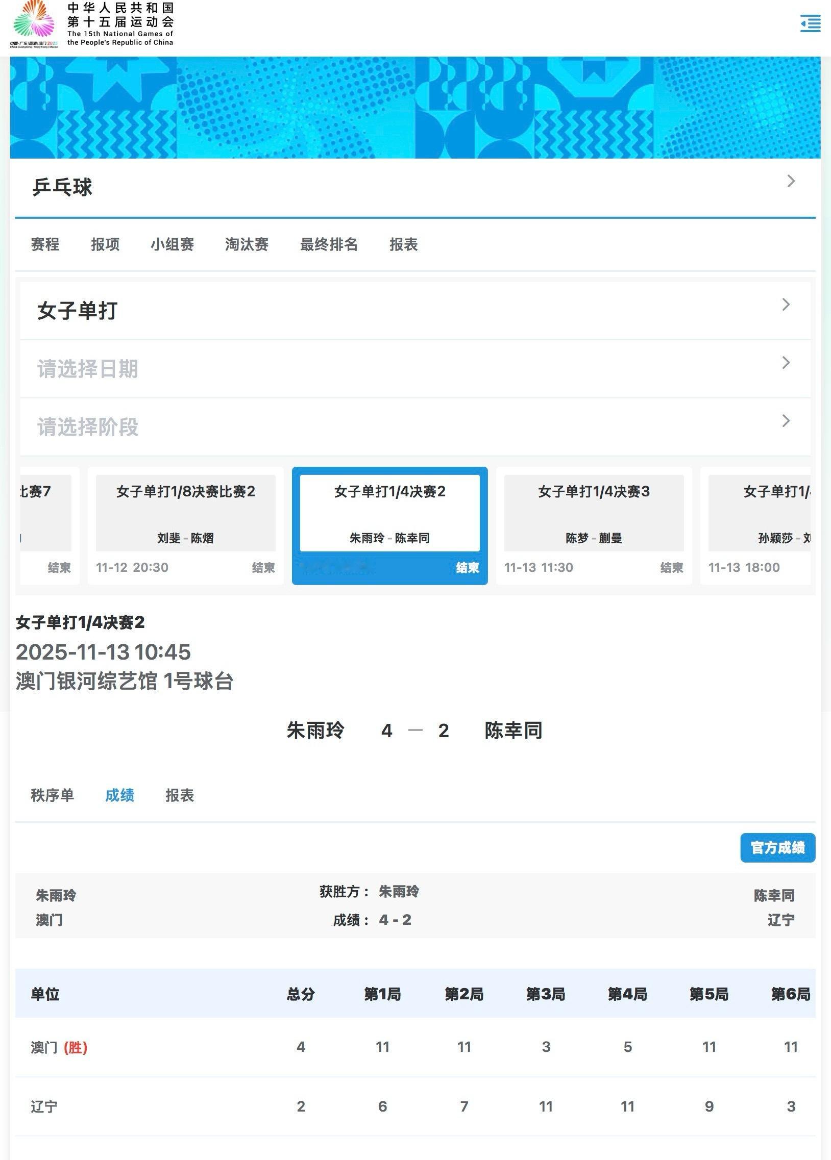 2025大湾区全运会女子团体D组辽宁1-0四川陈幸同/王艺迪3-0冷雨桐/郭艳(