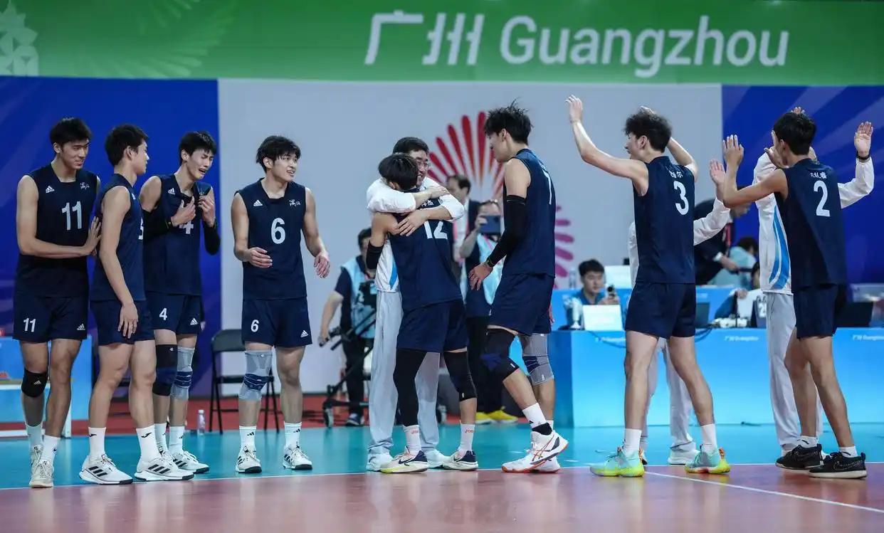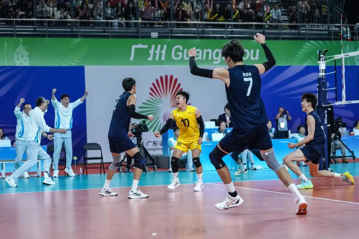 【新华社组照: U20男排浙江队夺冠】11月12日,在广州进行的第十五届全国运动会排球男子20岁以下组决赛中,浙江队3比1战胜江苏队,夺得冠军(新华社记者 潘昱龙 摄)。