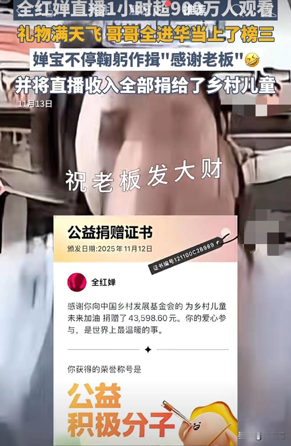 谁能想到 奥运冠军的直播能土得这么可爱? 全红婵昨晚首秀,1小时涌进900万人,礼物刷得满屏飞 她攥着手机连鞠好几个躬,嘴笨得只会重复“感谢老板” 还跟朋友吐槽“这功能我真玩不明白,跟老头似的” 她哥打赏直接冲上榜三结果下播没俩小时 43598块6毛的收入,一分没留全捐给了乡村儿童,证书都晒出来了 现在运动员直播要么走“精英范儿”要么带货 但她这“赛场封神、直播犯懵、捐钱爽利”的劲儿,才是真的“没架子” 我们追的不就是这种“不装”的鲜活吗 毕竟,比起完美人设,“真实”才是最值钱的流量