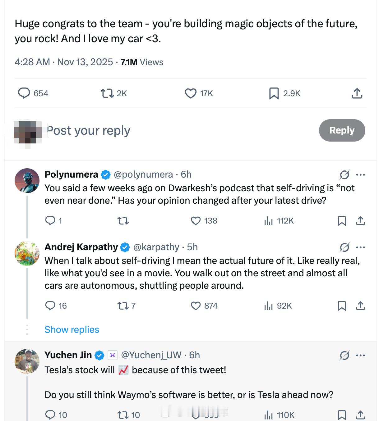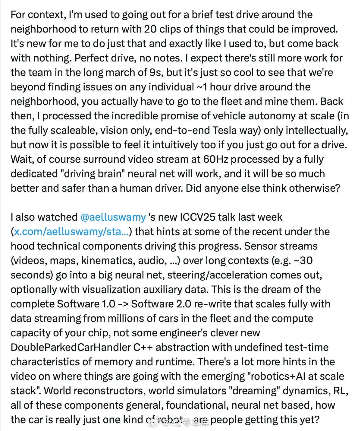 特斯拉前人工智能总监 Andrej Karpathy 写了一篇巨长的帖子夸 HW4 版的 FSD:它开得非常好,非常、平稳、自信,明显比我习惯的 HW3 好。「让我更意外的是,车辆轻松处理了以前让我失眠的各种棘手场景:- 在狭窄车道与迎面来车会车;- 绕开施工区域和临时停在车道里的车辆;- 面对双向来车,准确把握时机完成复杂左转;- 在四向停牌口,礼貌让行给插队的车辆;- 在拥堵车流中找到空隙挤进去顺利转弯;- 超越正在上下客的公交车,但仍然在被遮挡的停牌前停下;- 在停车场绕了一圈,找到车位并自动泊车。全程无瑕疵。」