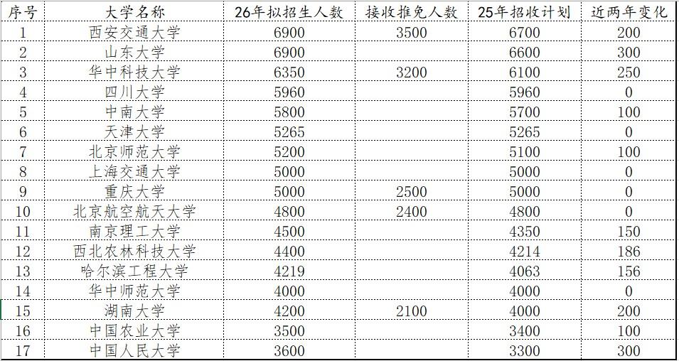 2026年研招统考计划真的被推免生抢占了吗?来,看一看这所老牌985大学的统招计划,就知道了! 近日,常听到一些貌似26届的考生在视频中抱怨:研招计划已被推免生抢占,统考计划大幅缩招,此种信息甚至推动着“缩招恐慌”在考研圈迅速蔓延。那么,2026年研招统考计划真的大幅减少吗? 一、2026年院校推免率普遍在提高,这是一个不争的现实,但2026年院校招生计划,特别是优质院校的总体计划也是在增长,这也真实存在。我们在对比分析近20所985大学两年的招生计划时,发现十余所总体计划是在增长的。这说明,增长仍是总趋势。 二、具体到某一所院校,2026年统招计划总体也是在增长的。不信,我们来看看东南大学2026年的统招计划就明白了。东南大学2026年全日制统招计划为2706人,相比2025年,增加了141个计划。2026届推免生在增多,但总体计划增长得更多。 具体到每所学院,虽然有不少(12个)学院统招计划在减少,一方面是因为推免生增多了,但更重要的是总体计划减得更多了。比如法学院,统招计划减少了83人,幅度极大,2026年仅有仅为去年27.8%,显然,我们不应把计划减少全部归结于推免生增多。 专业统招计划的减少,各有各的原因,好在这不是主流,2026年统招计划总体在增长,仍是主旋律。