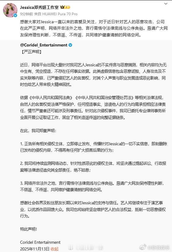 13日,有网友发现今年3月郑秀妍因违约被起诉。刚刚, 发声明回应:“网络平台出现大量针对我司艺人Jessica的不实传言与恶意揣测,相关内容均为无中生有、凭空捏造,不存在任何事实依据。”