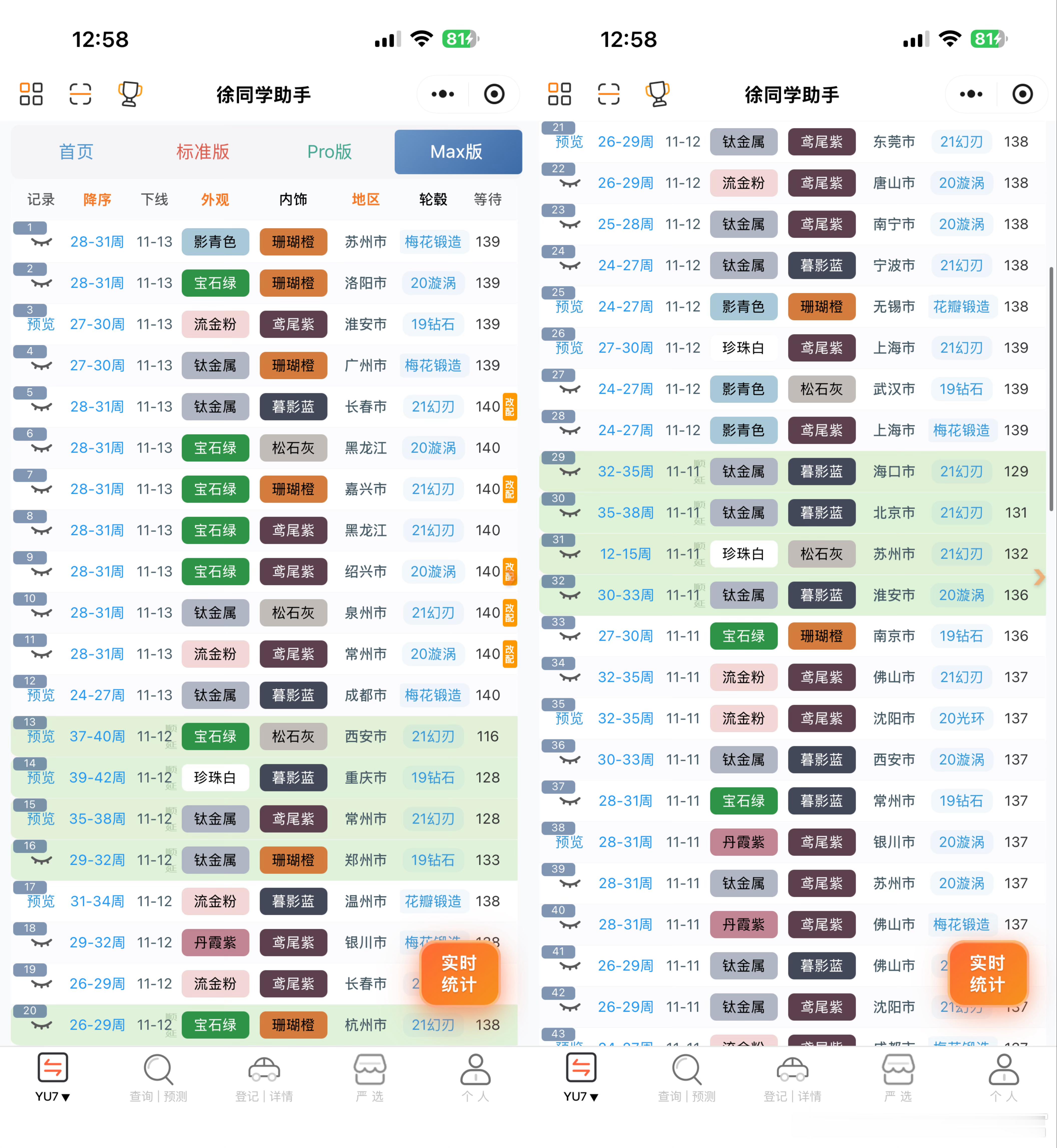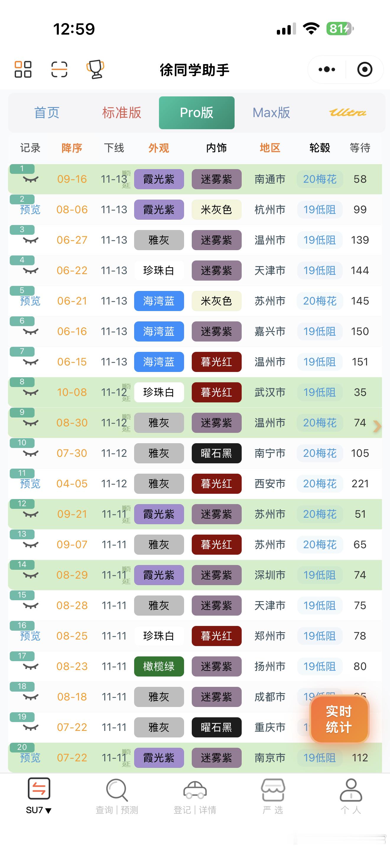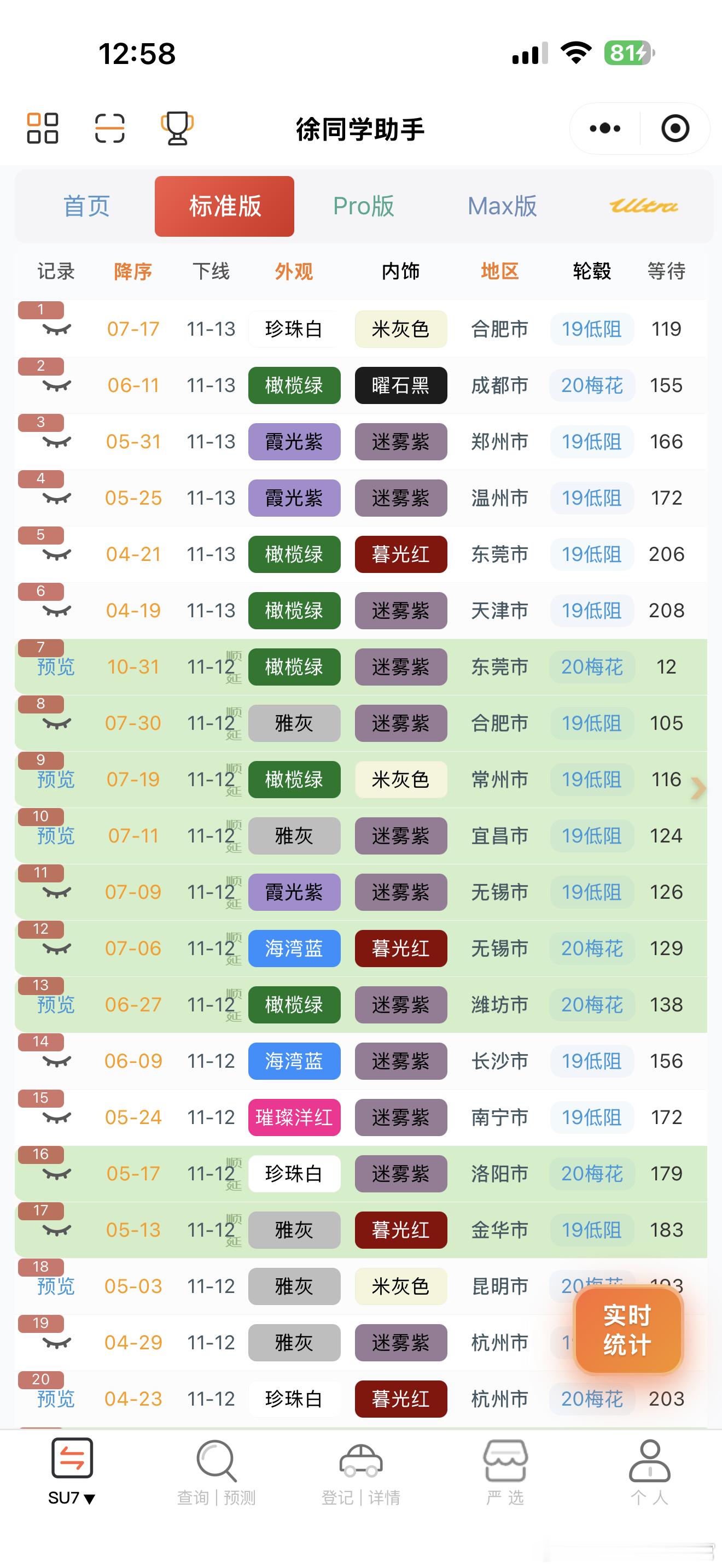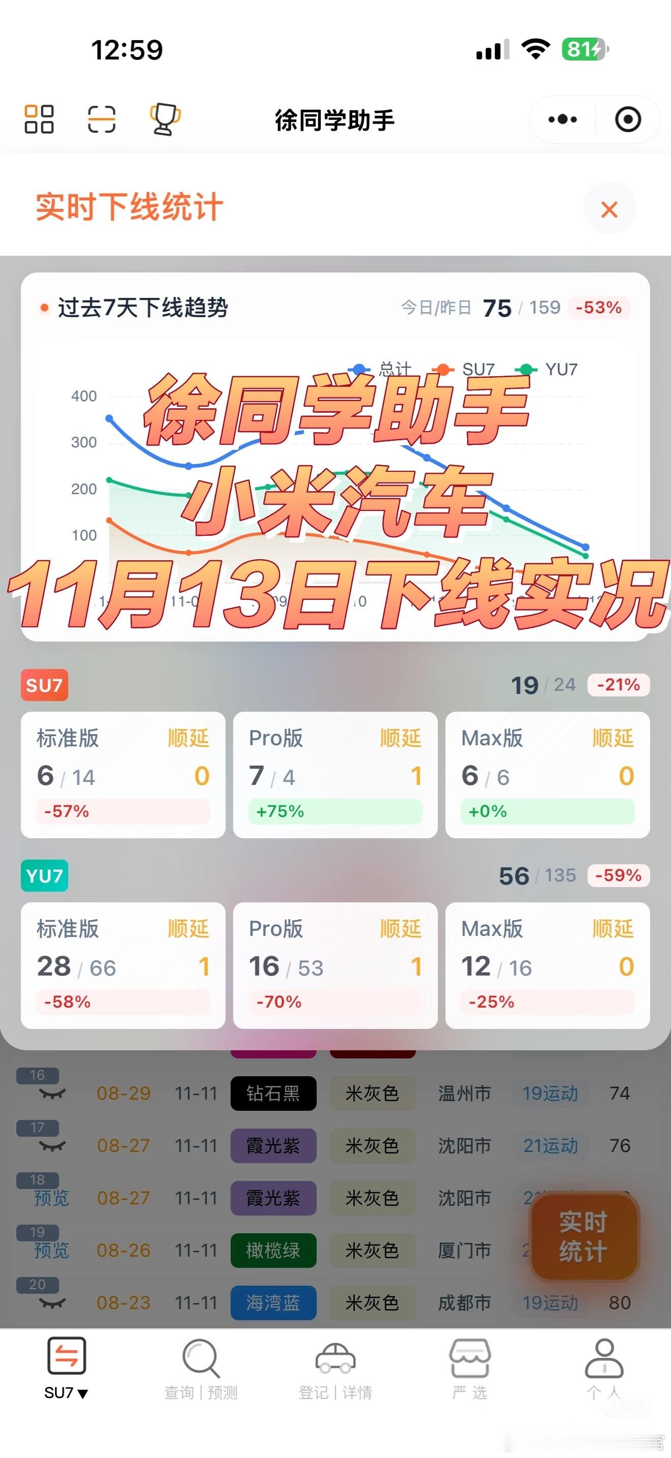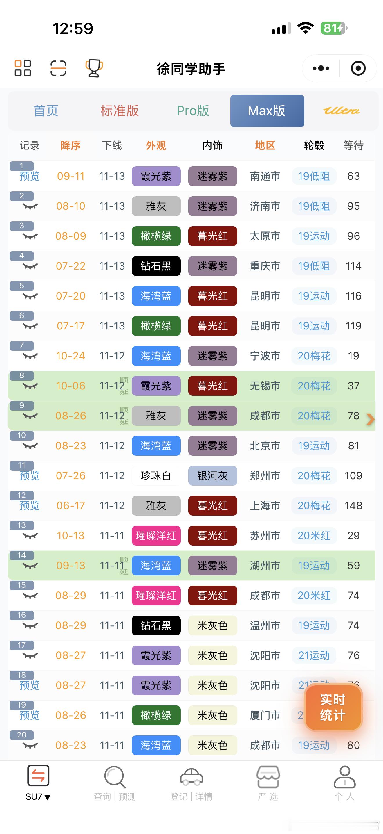 小米汽车(11月13日)下线实况小米SU7预测模型更新啦~(这两天产线调整,为清仓做准备)🌀YU7(据不完全统计)合计139台1️⃣标准:下线69台,初始24-25-26-27周的都在正常下线,稀有色来了一批2️⃣Pro:下线53台,大部队在跳周前的26周左右,跳周后23周左右,寒武岩灰还有一批3️⃣Max:下线17台,下的不多,但是大部队快到28周了🌀SU7(据不完全统计)合计25台1️⃣标准:下线14台,以为改配的会不少,实际上真没多少2️⃣Pro:下线4台,按顺序集中下线3️⃣Max:下线7台,没啥车,涉及产线调整4️⃣ultra:小米高端俱乐部活动好丰富更多关于小米汽车的最新资讯和深度解析,请参考【米车派】~
