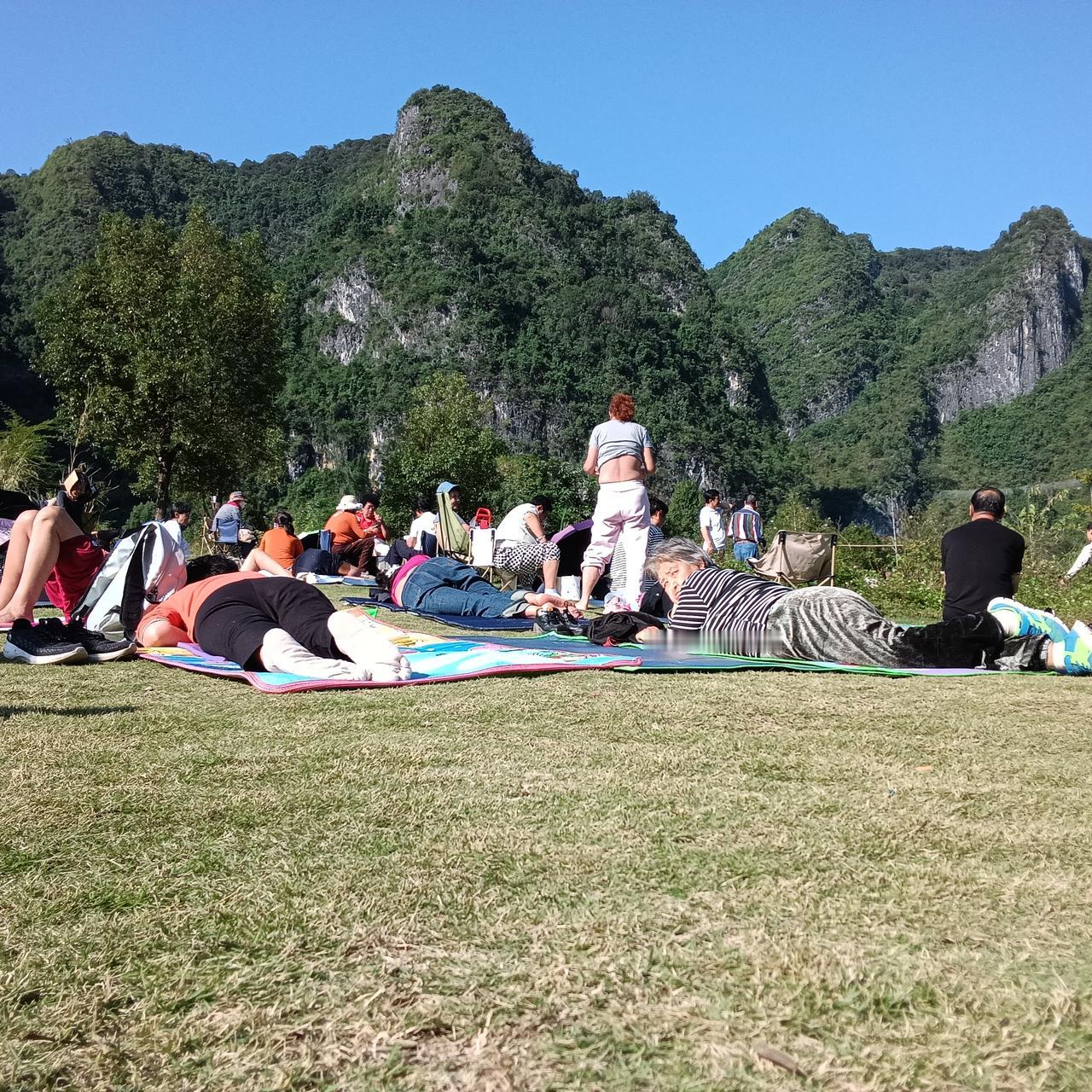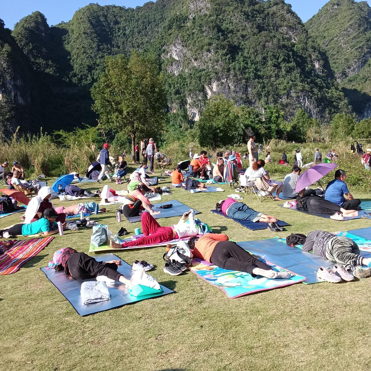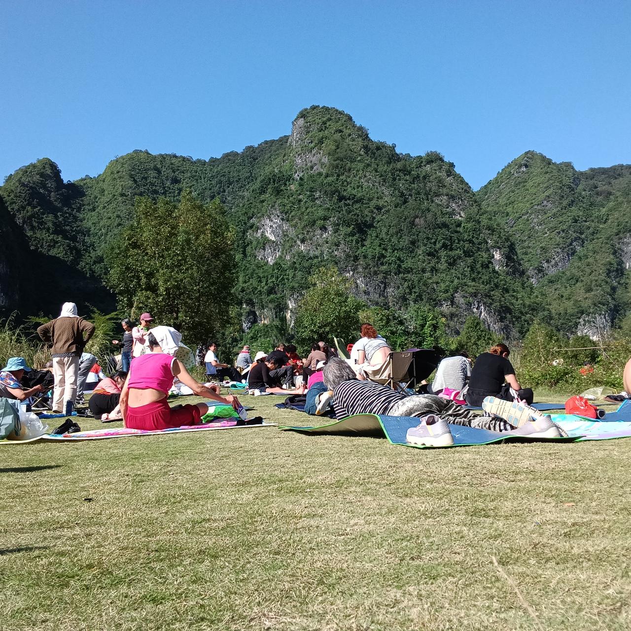 巴马初冬的晴朗天儿 康养人日光浴正当时 巴马的养生宜居因素中,有一个重要的因素,这里的日光红外线强于紫外线,因而照在皮肤上不会晒伤皮肤,还对人体有很好的益处。 因而,来到巴马的康养人会选择晴好的天气做日光浴。 我们你找到的最好的日光浴场在坡月村到百魔屯中间,一块四周被山环绕的草地。 今天天气格外晴好,打破了之前联姻的天气,气温也从十八九度升至二十五六度。 下午2:30我和老伴来到了这片日光浴场。 已经有近百人在我们的目之所及中晒起了被晒起了腿。人们带着野外用的垫子,可以平躺,侧躺,可以俯卧,还有的人坐着只晒后背。 更有一些喜爱运动的朋友在草地上光脚行走、慢跑、做操、唱歌、练声、跳舞。日光浴的形式真是太丰富多彩了。