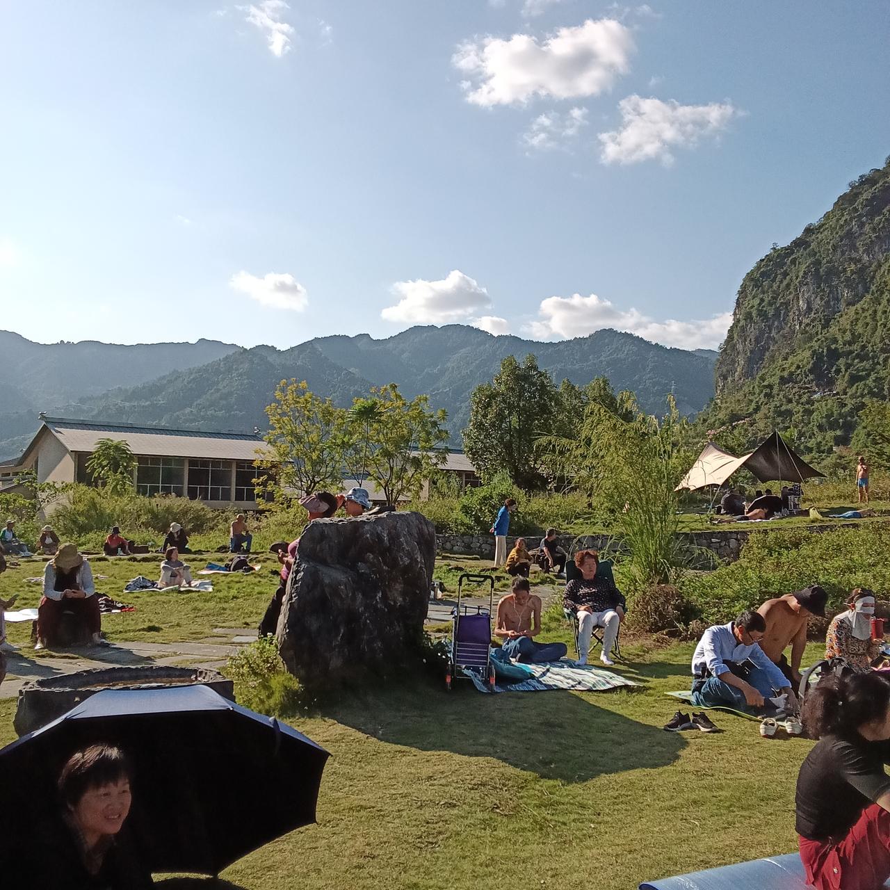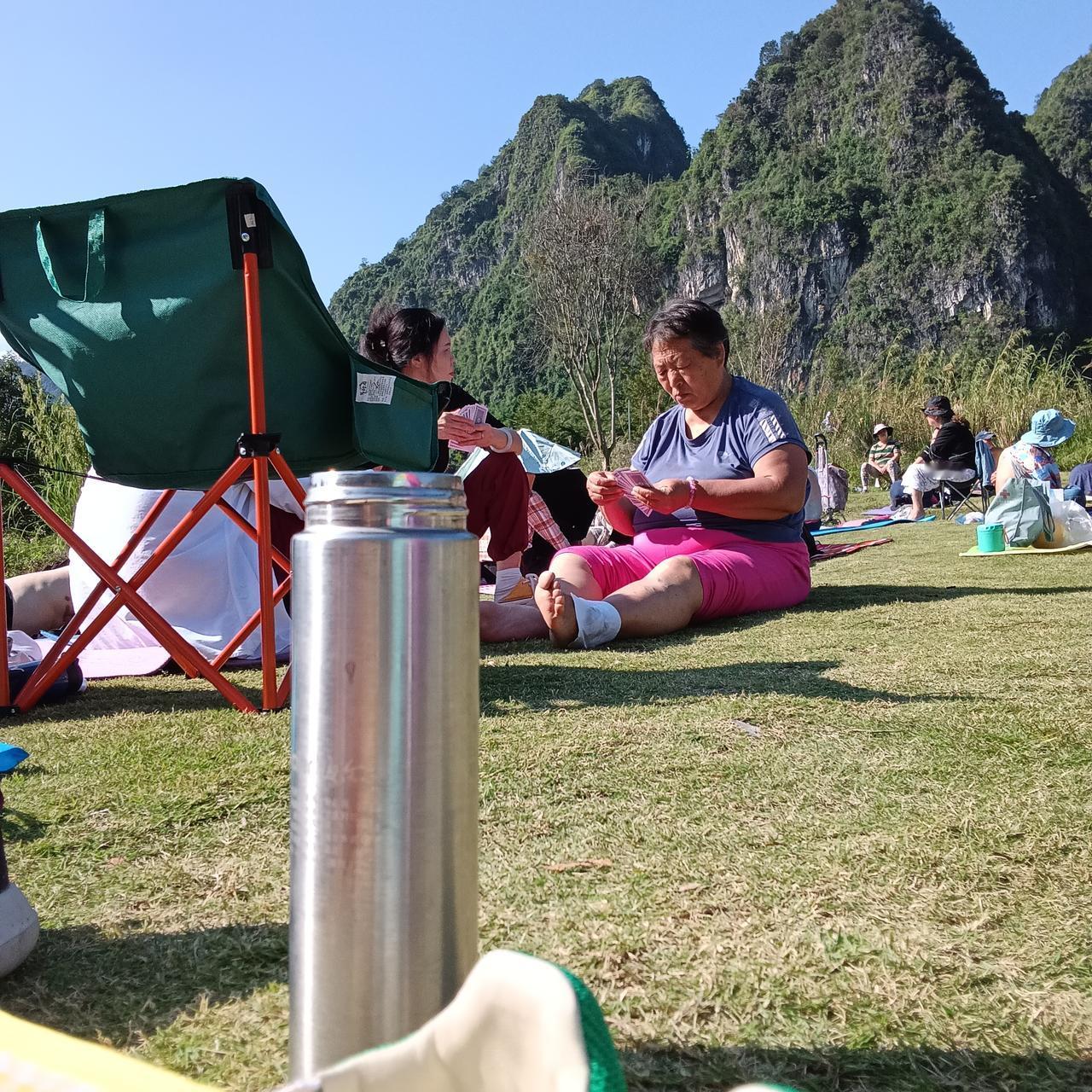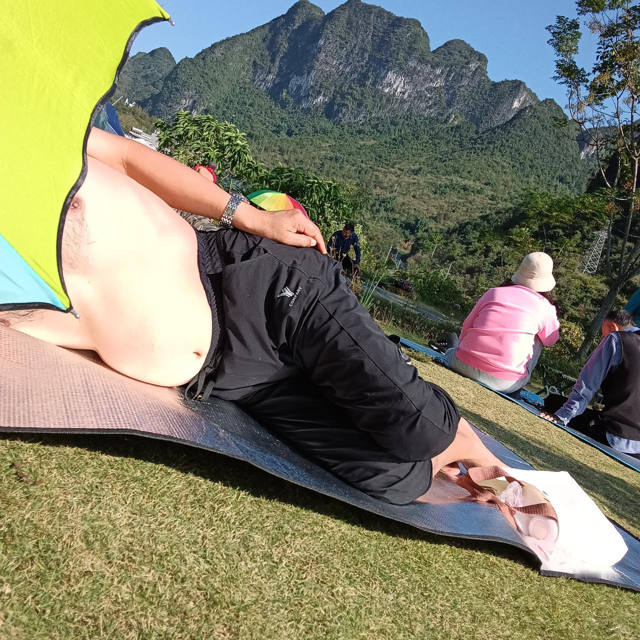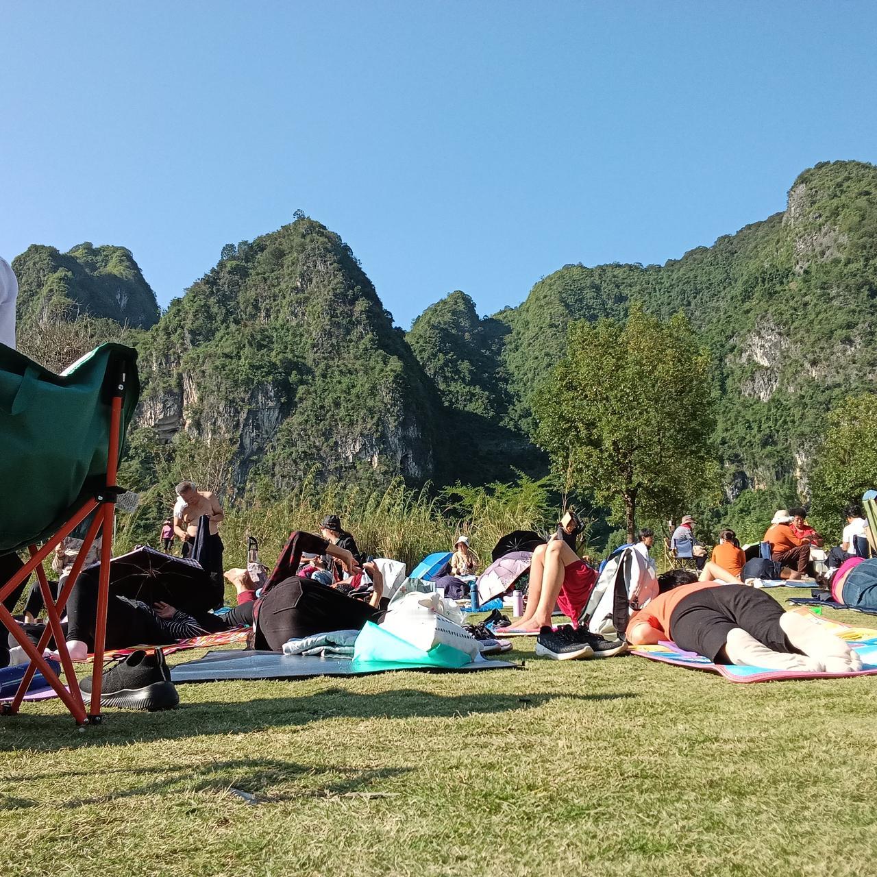 巴马初冬的晴朗天儿 康养人日光浴正当时 巴马的养生宜居因素中,有一个重要的因素,这里的日光红外线强于紫外线,因而照在皮肤上不会晒伤皮肤,还对人体有很好的益处。 因而,来到巴马的康养人会选择晴好的天气做日光浴。 我们你找到的最好的日光浴场在坡月村到百魔屯中间,一块四周被山环绕的草地。 今天天气格外晴好,打破了之前联姻的天气,气温也从十八九度升至二十五六度。 下午2:30我和老伴来到了这片日光浴场。 已经有近百人在我们的目之所及中晒起了被晒起了腿。人们带着野外用的垫子,可以平躺,侧躺,可以俯卧,还有的人坐着只晒后背。 更有一些喜爱运动的朋友在草地上光脚行走、慢跑、做操、唱歌、练声、跳舞。日光浴的形式真是太丰富多彩了。