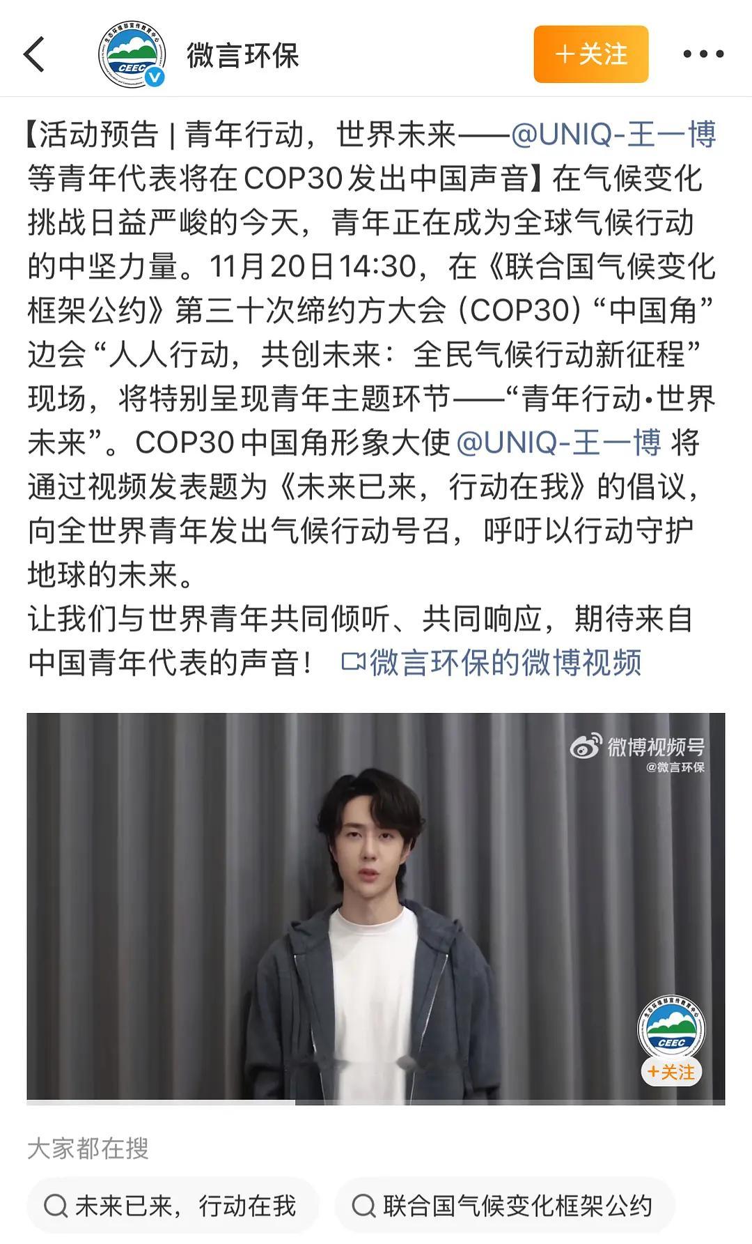 王一博《寻护者》又又又获奖,野生救援纪录片项目再添重磅荣誉,保护穿山甲系列纪录片《寻护者》荣获2025年中国公益广告黄河奖优秀作品。王一博今天官宣新身份《联合国气候变化框架公约》第三十次缔约方大会(COP30),真优质青年代表,各种主流活动、文宣活动从不缺席。王一博做什么都很优秀
