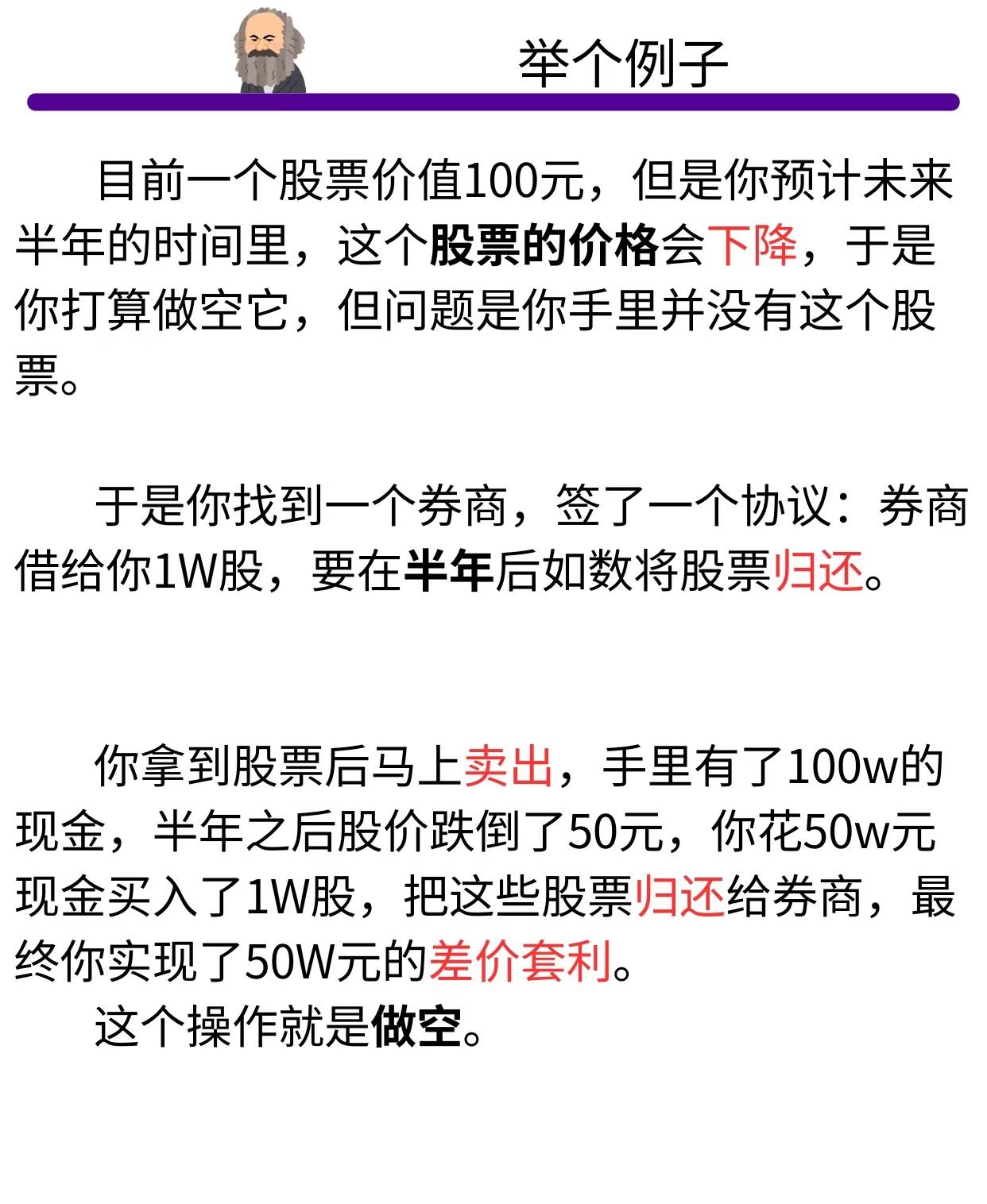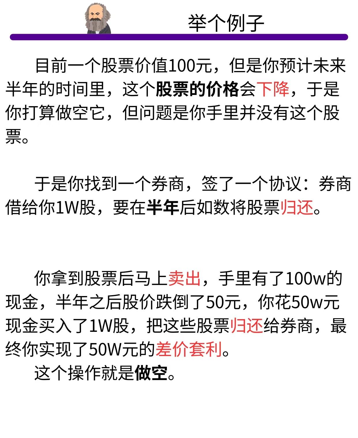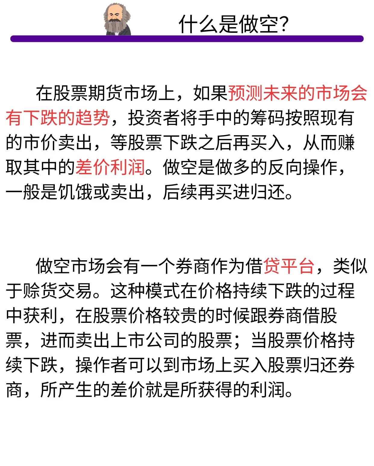 什么是做空? 1. 做空的基本概念(第1张图) - 定义:做空(Short Selling)是股票/期货市场中的一种投资策略,与“做多”(先买后卖)相反。 - 操作方式: - 预测市场下跌:投资者认为某只股票或资产未来价格会下跌。 - 借入并卖出:通过券商(借贷平台)借入股票,按当前高价卖出。 - 低价买回归还:等股价下跌后,再从市场低价买回相同数量的股票,归还给券商。 - 赚取差价:卖出价与买入价的差额就是利润。 - 关键点: - 需要券商提供股票借贷服务(类似“赊货交易”)。 - 风险较高,因为如果股价上涨,投资者可能面临亏损。 2. 做空的例子(第2、3张图) 情景: - 某股票当前价格 100元,但投资者预测 未来半年会跌到更低(如50元),于是决定做空。 - 但投资者自己没有这只股票,所以需要向券商借入。 操作步骤: 1. 借入股票:投资者与券商签订协议,借入 1万股(1W股),并承诺 半年后归还。 2. 卖出股票:立即按 100元/股 卖出,获得 100万元现金。 3. 等待股价下跌:半年后,股价真的跌到 50元/股。 4. 低价买回:用 50万元 买回 1万股(50元 × 1W股 = 50万元)。 5. 归还股票:把买回的1万股还给券商,完成交易。 6. 计算利润: - 卖出收入:100万元 - 买入成本:50万元 - 利润 = 100万 - 50万 = 50万元(即 差价套利) 关键术语(红字强调): - 做空(核心操作) - 券商借给你1W股,要在半年后如数将股票归还(借贷关系) - 卖出(高价卖出借来的股票) - 差价套利(最终赚的钱) 3. 总结做空的核心逻辑 ✅ 适用场景:投资者看跌某只股票或市场。 ✅ 操作流程:借 → 卖 → 跌 → 买 → 还 → 赚差价。 ✅ 风险提示: - 如果股价 上涨,投资者可能被迫高价买回股票,导致亏损(甚至无限亏损)。 - 需要 券商支持(不是所有股票都能做空)。 📌 简单记忆: “先借股票高价卖,等跌了再低价买回来还,中间的差价就是利润!”