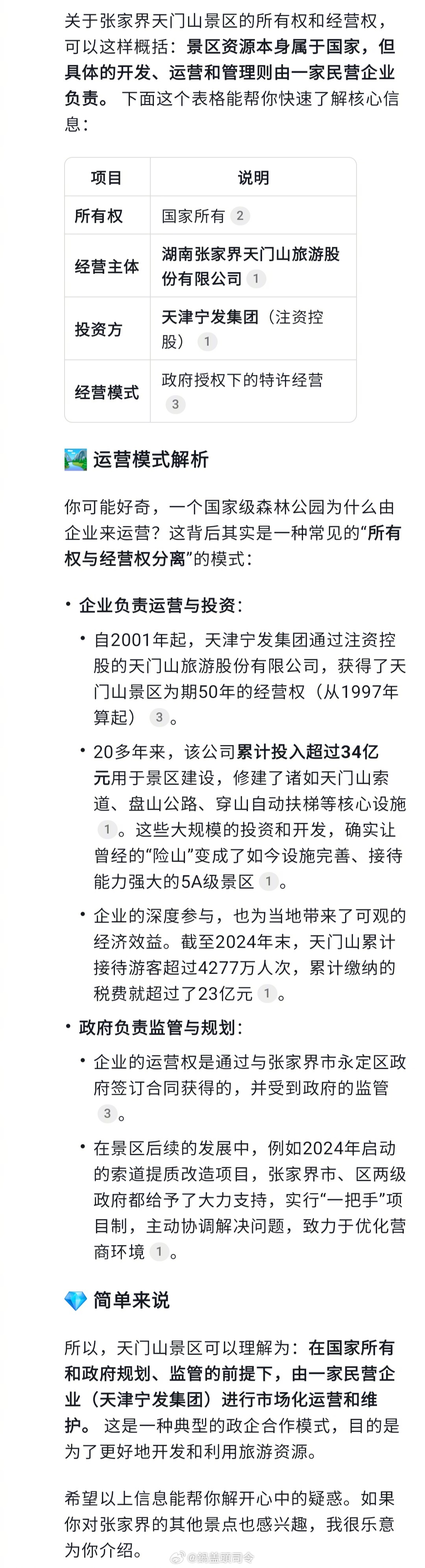 查了一下,天门山景区是当地旅游公司运营,背后大股东是天津公司。经营是企业,所有归国家。20多年企业累计投资30多亿,累计纳税23亿。