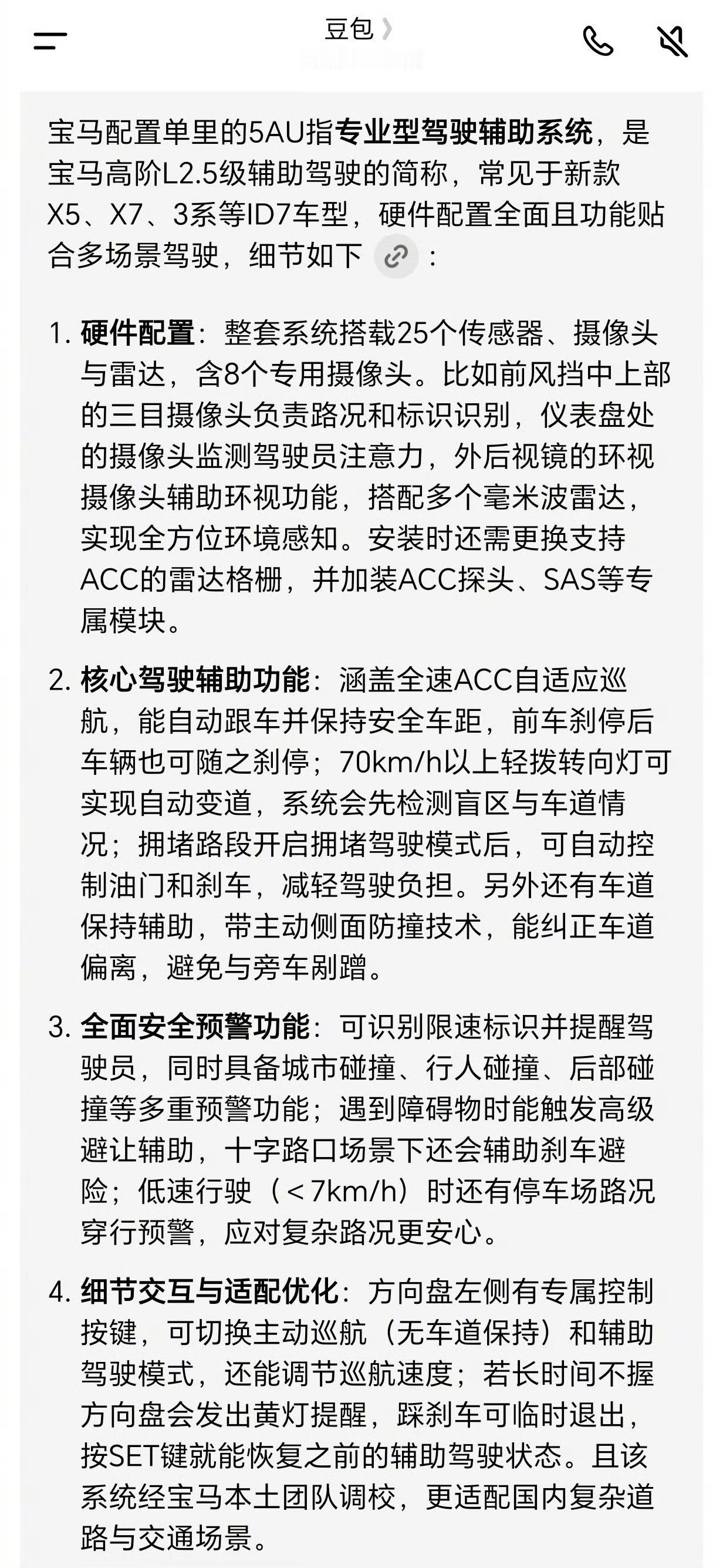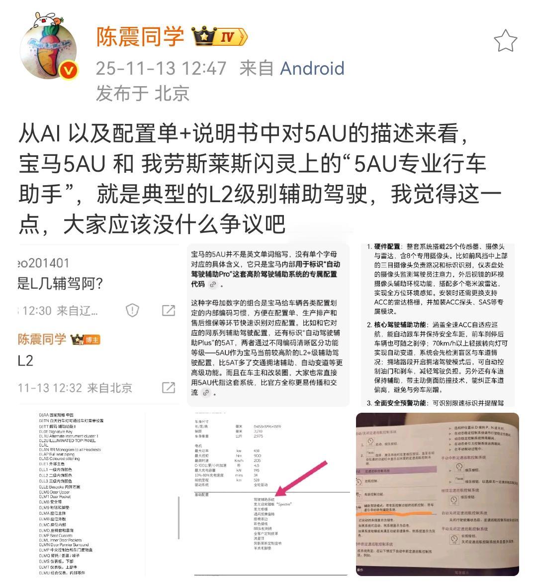 陈震:从AI 以及配置单+说明书中对5AU的描述来看,宝马5AU 和 我劳斯莱斯闪灵上的“5AU专业行车助手”,就是典型的L2级别辅助驾驶,我觉得这一点,大家应该没什么争议吧! 关于劳斯莱斯闪灵上的辅助驾驶系统到底属于什么级别,陈震与网友进行了充分的辩论,从说明书和AI的解释上来看,该辅助系统是L2级别。 这个也没有什么争议了,毕竟陈震都把劳斯莱斯闪灵给卖了,原则上这已经不属于陈震的东西了。 各位是怎么看的?欢迎评论区留言。