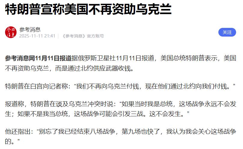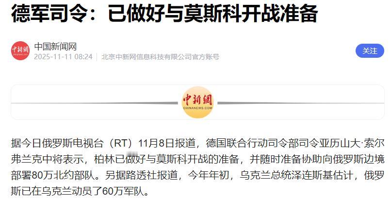 俄军红军城战斗胜利在即,德国宣布部署80万兵力,结果特朗普却给北约当头棒喝! 11月12日,红军城内乌军精锐第38海军陆战旅向俄军投降,这则消息意味着俄军在红军城战役中的胜势已定。然而这种态势,却让欧洲国家立刻绷紧了神经,德国率先跳出来表态。 早在11月8日,德国联合行动司令部司令亚历山大·索尔弗兰克高调宣布已做好和俄罗斯开战准备,80万北约部队将随时部署到俄罗斯边境。这话听着确实唬人,但稍微扒拉一下数据就知道里面的水分不小。 要知道整个北约2025年的总现役军人数量也就350万左右,美国贡献了140万,土耳其近50万,德国自己的现役兵力才18.2万。 就算把法国、意大利那各20万凑过来,再加上其他成员国的兵力,要凑出80万作战部队可不是件容易事,更别说这些兵力还得从各自防区抽调,真要完成部署没个半年都下不来。 而且德国国防部刚在11月7日透露,他们计划到2035年才把包括现役与预备役在内的总兵力扩充到46万,现在就喊出80万部署计划,未免有点打肿脸充胖子的嫌疑。与其说是军事部署,不如说是给盟友壮胆的政治表态更贴切。 而就在德国忙着摆姿态的时候,美国总统特朗普一盆冷水浇了下来。 11月11日,特朗普在接受记者采访时,一句“我们不再向乌克兰付钱”,直接给北约盟友们来了个当头棒喝。 截至2024财年美国国会批准的援乌资金号称有1750亿美元,但乌克兰总统泽连斯基都忍不住抱怨实际收到的还不到760亿,而且绝大部分是武器援助,真正能自由支配的现金少得可怜。 有意思的是,这些援助资金里有80%都留在了美国本土,要么是采购美国军火商的武器,要么是投入到国内相关产业,说白了就是美国用乌克兰的战事拉动自己的经济。现在特朗普突然说不付钱了,受损最大的不仅是乌克兰,还有那些等着美国兜底的欧洲国家。 德国嘴上喊着要派80万兵,可北约新设定的5%GDP军费目标他们都还没达标,2025年刚把国防军规模提升到18.2万,连自己设定的26万现役目标都没实现,真要开打恐怕连弹药补给都得指望美国,现在美国突然断供,这戏就有点唱不下去了。 这下可好,德国高调的军事表态遇上美国务实的撤资声明,北约内部的裂痕算是彻底摆到了台面上,真要和俄罗斯硬碰硬,恐怕这些盟友们先得自己吵一架才能拿出统一立场。