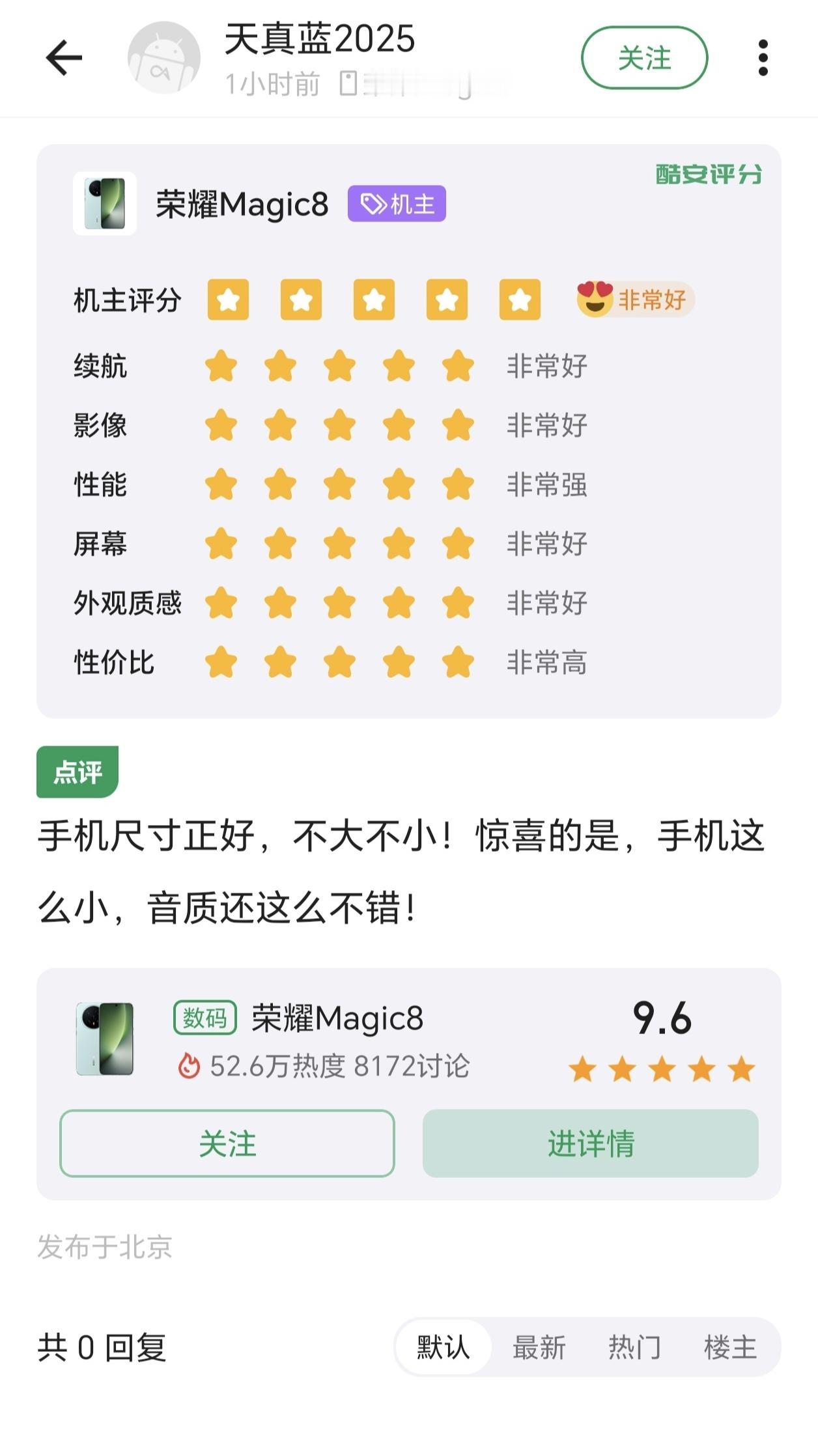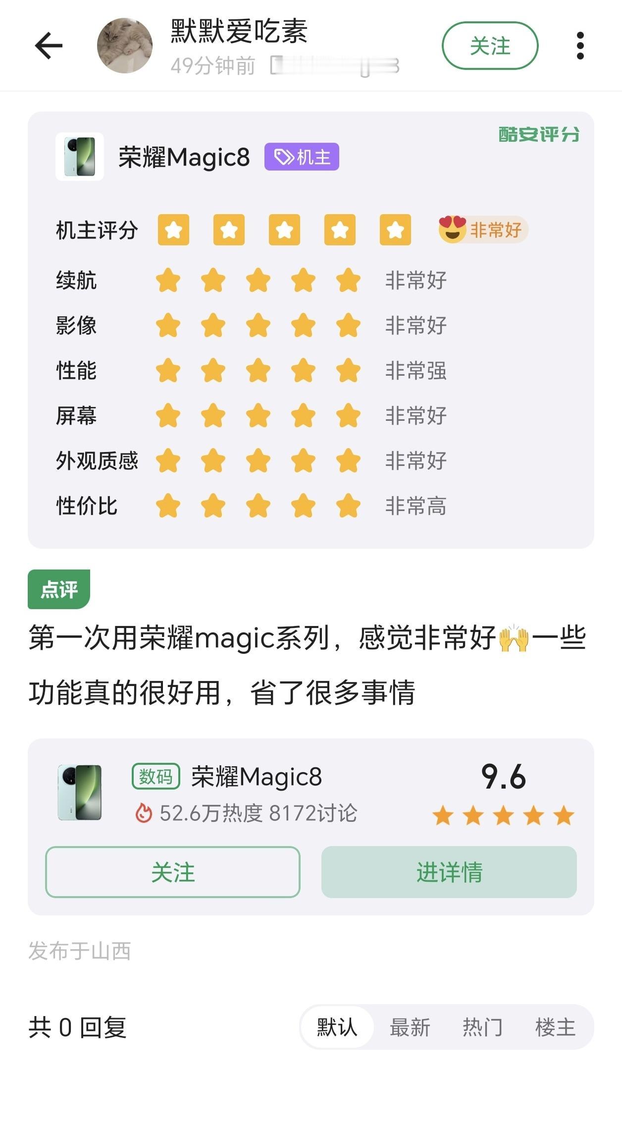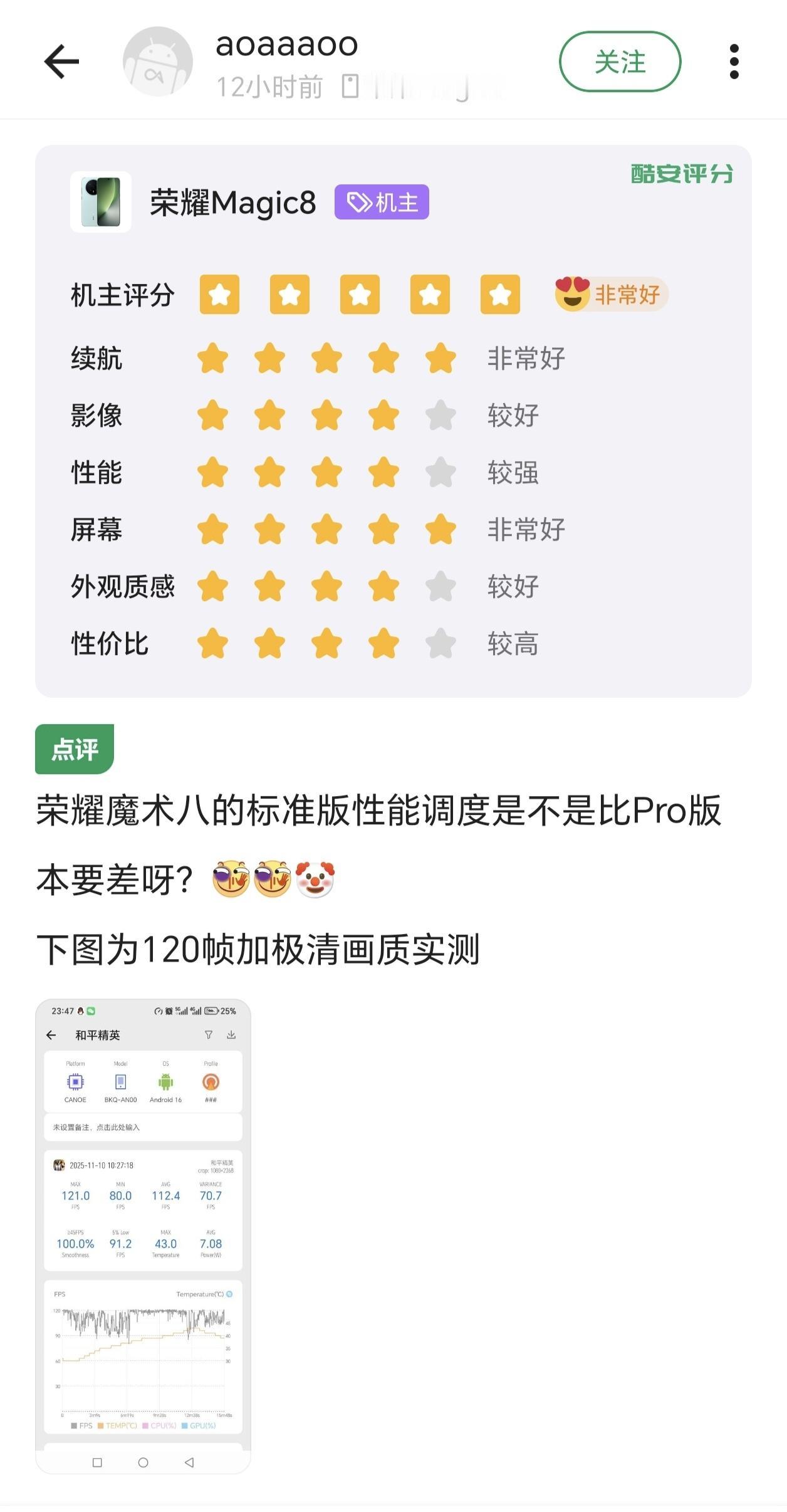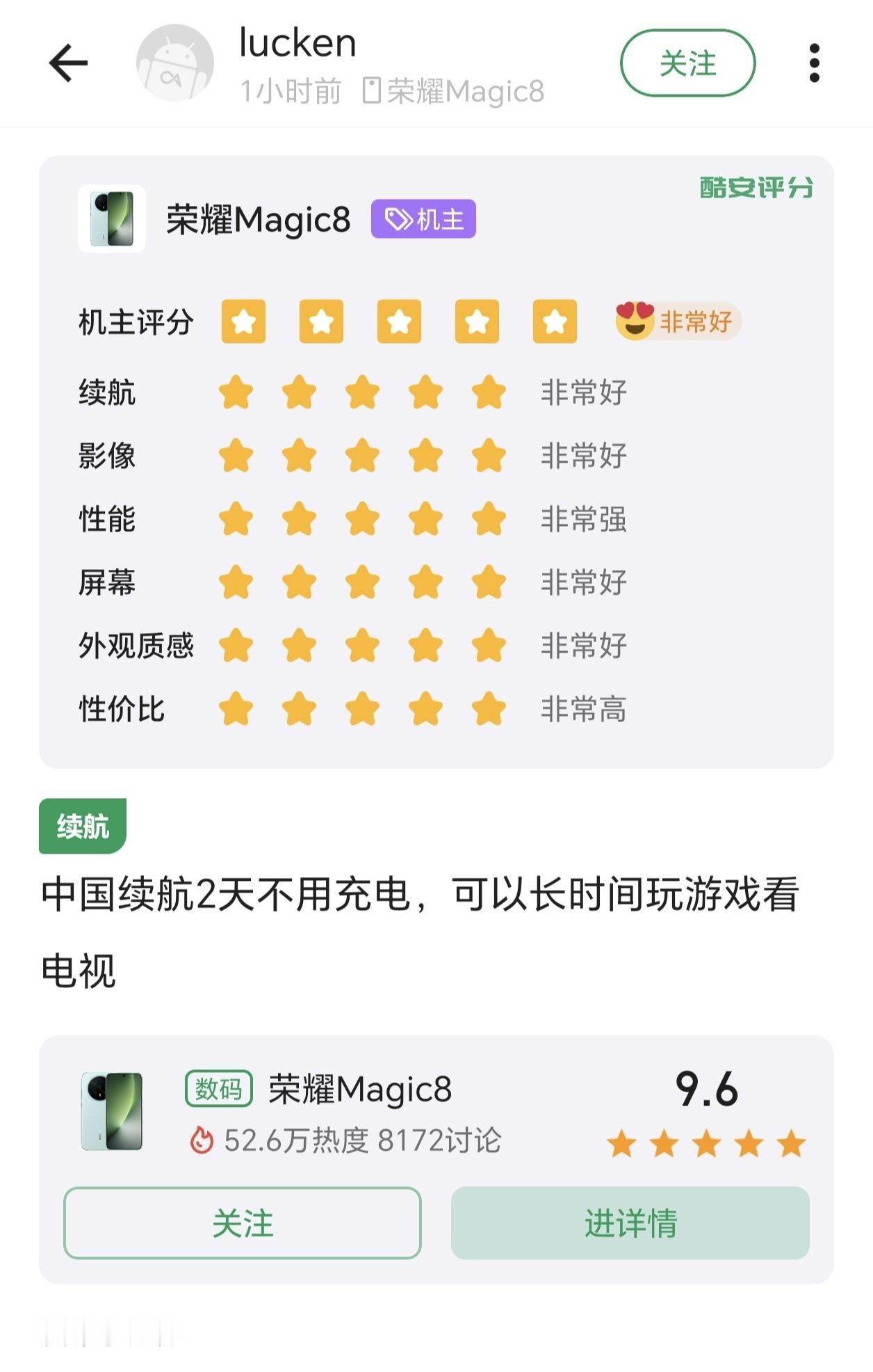 荣耀Magic8这个标准版不标准啊,但把性能、影像、屏幕、系统优化,电池等等拿出来都是Pro级的,荣耀这次全给放在标准版上,在某安上荣耀Magic8更是一水的高分好评,还都是真实机主的真实反馈,不得不说荣耀Magic8有点东西。