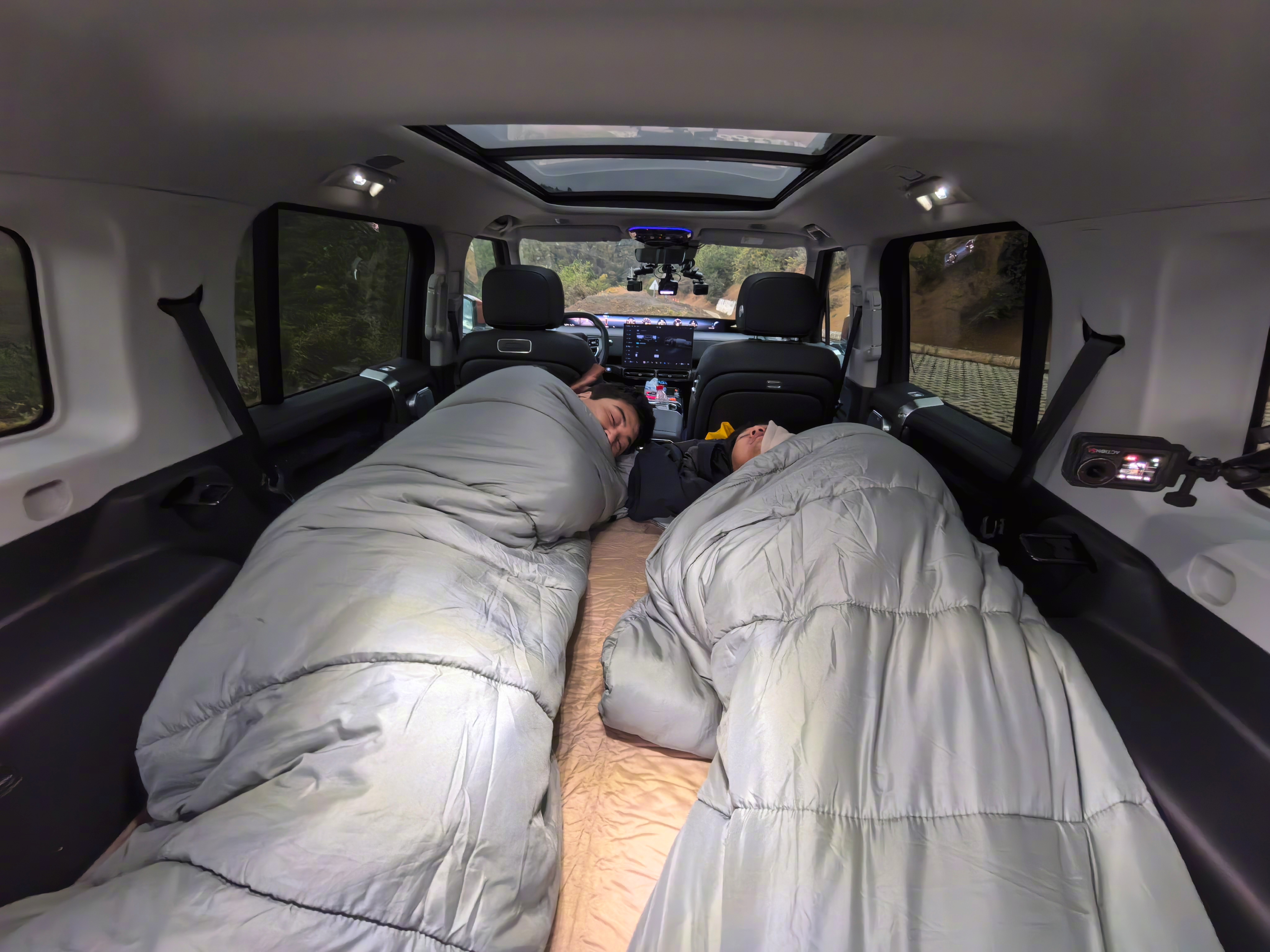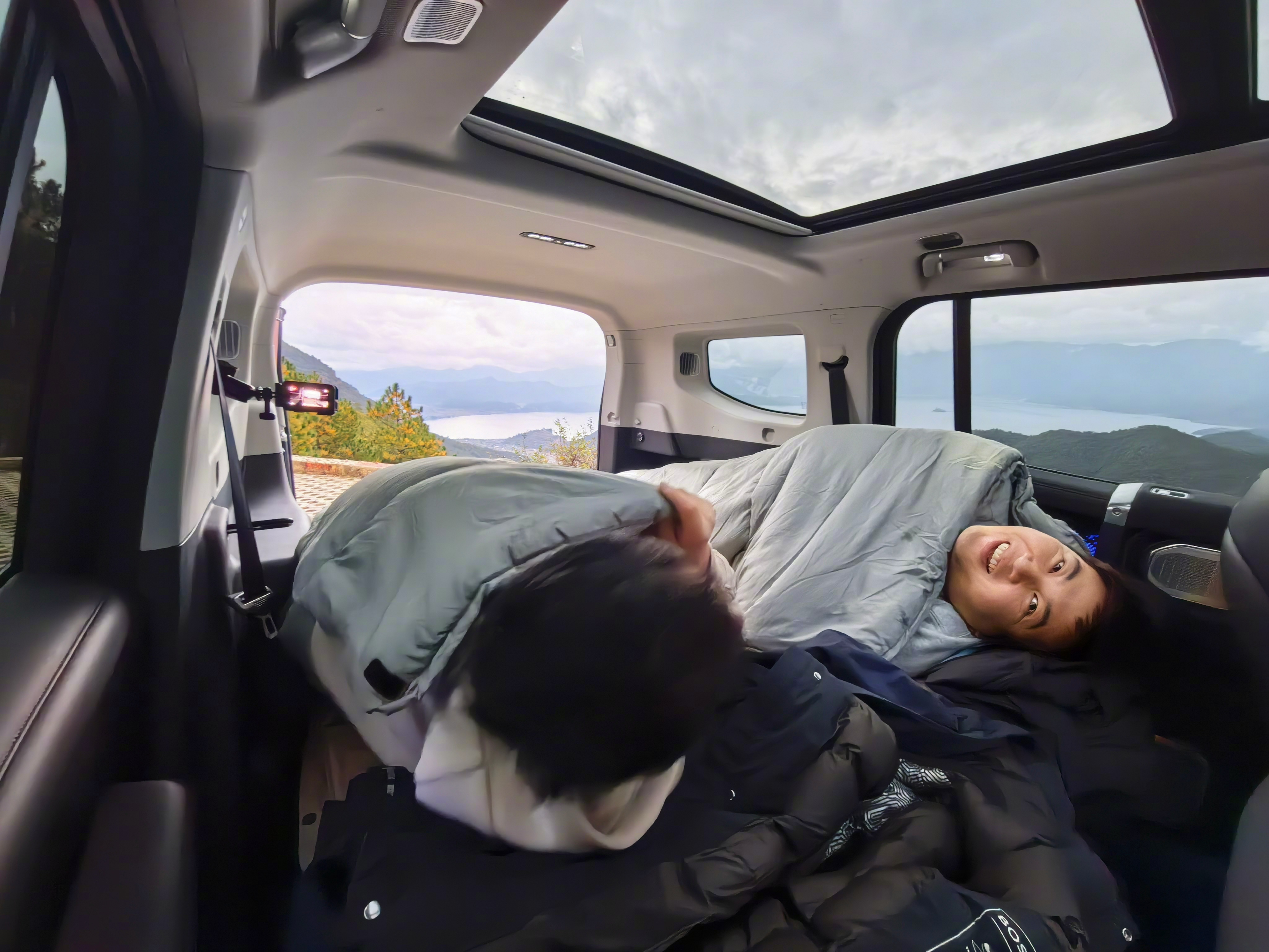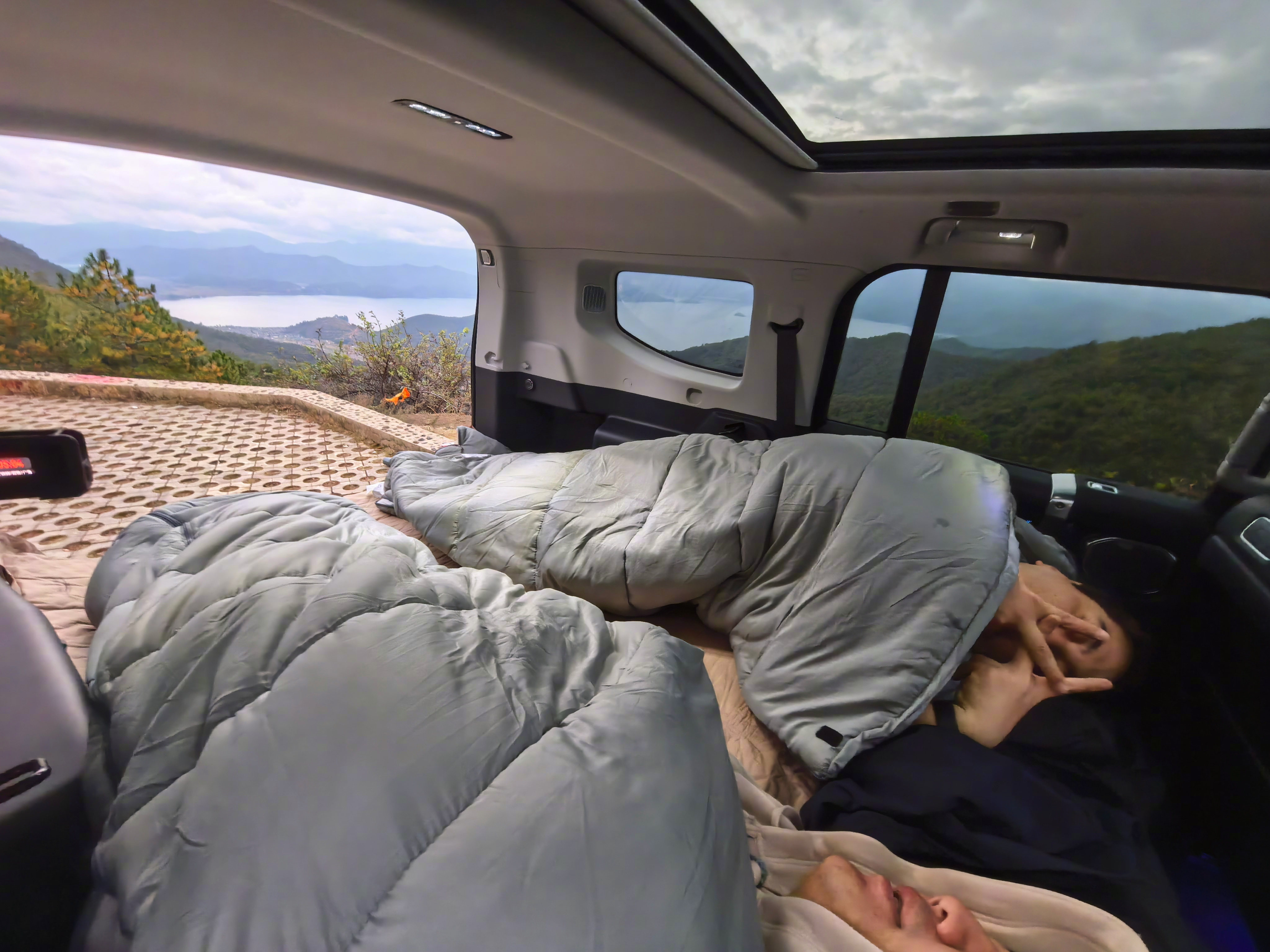 昨夜啥哥俩住的纵横G700里,因为约好今天看日出。我就下山去睡觉,哈哈哈哈,一早去观景台再找他俩。G700五座版放倒第二排空间巨大,睡俩男人都够宽,大家注意俩人之间空间,还是很宽的,车里垂直高度也很高。一开尾门这妥妥湖边豪华大床房啊。但最终很遗憾,都是云,没看到日出。泸沽湖还是很好看的,值得大家来啊!