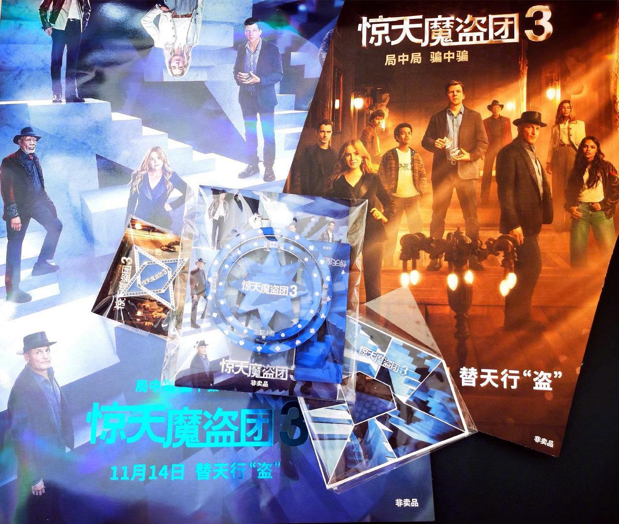 【影迷福利】官方周边《惊天魔盗团3》11.14内地同步北美公映,“四骑士”暌违十年后全员回归,横跨全球的魔术大秀,骗中骗、局中局、计中计让人超级期待!从关+转中抽1位影迷小伙伴,送出以下周边套装:【电影官方海报、亚克力摆件、魔术盒、视觉卡、徽章、票根】,下周 送出~ 剧情讲述神秘组织“天眼”用塔罗牌牵动“初代四骑士”与三位新生代魔术师,联手对抗“血色钻石”家族背后的全球犯罪网络,杰西·艾森伯格、伍迪·哈里森、艾拉·费舍尔、戴夫·弗兰科回归主演,更有裴淳华加盟饰演“钻石皇后”,相信耀眼卡司之间的巅峰博弈,会让魔盗团影迷们一本满足。
