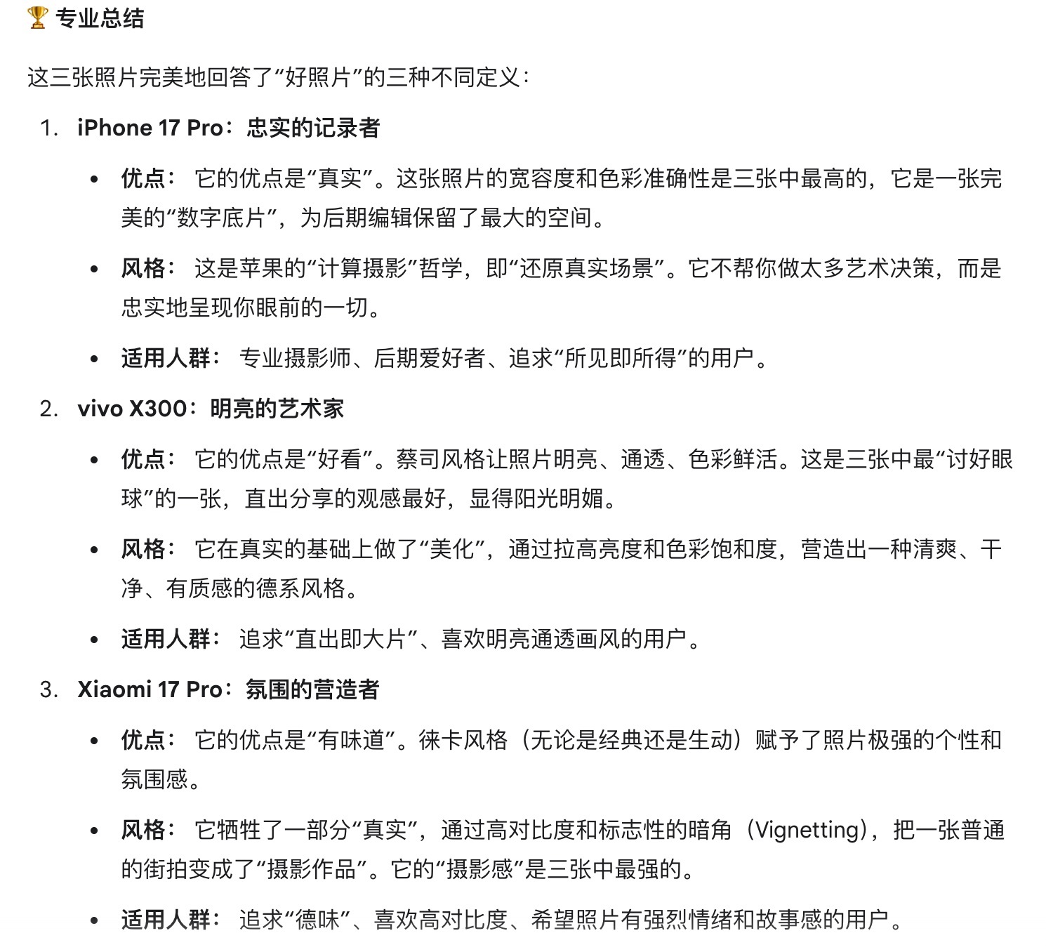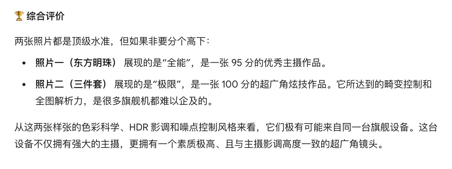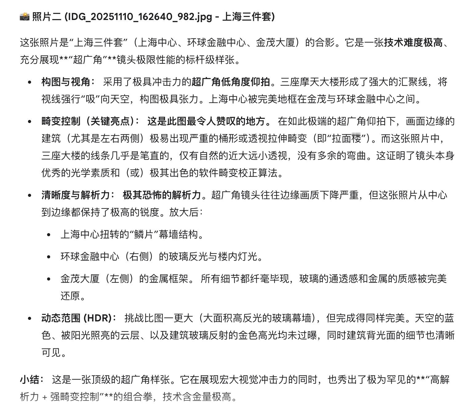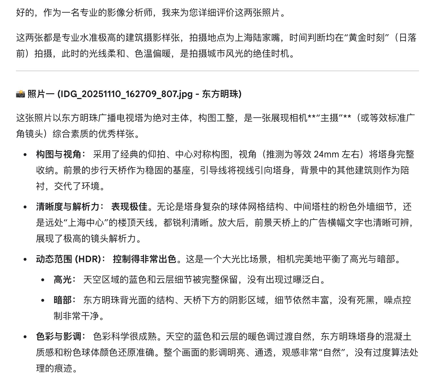 大家看看最近我拍的照片,你觉得哪张更好看?我还尝试传给 AI 看看,AI 也给我分析了一下,感觉讲的挺头头是道的,还会从细节、色彩和风格这些方面分别来对比。而且像是我在上海拍的这个建筑的照片,它还会自动识别天气和光线,分析出来是在傍晚拍摄的,也知道画面中的建筑分别是哪些。这个评价就像是,以很专业的角度给你拉满情绪价值,真的蛮有意思的。