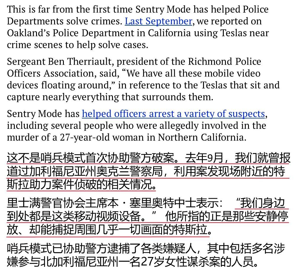 特斯拉哨兵模式再次立功,在美国西雅图的一起驾车枪击案中完整记录下了整个枪击过程,帮助当地警方迅速锁定嫌疑人。据外媒teslarati报道,涉事男子目前已被逮捕。据了解,这起案件初期线索稀缺,侦破工作一度进展困难,当地警察局警探表示:“特斯拉的智能功能在整个案件侦破的过程中发挥了关键作用。”这并非特斯拉哨兵模式首次协助警方破案。去年九月,加州奥克兰警察局就曾利用犯罪现场附近停放的特斯拉协助侦破案件。当地警官表示:“停放在各处、几乎能完整记录周围场景景象的特斯拉,已经成为我们破案时有力的助手。”哨兵模式是目前主流智能车标配的一种智能安全配置。一般情况下,该功能一旦检测到损害或者盗窃车辆等威胁,就会立刻记录数据,并发出警报提示车主,以便及时作出应对措施。因此,哨兵模式更被不少特斯拉车主称为“追损神器”。车主漱芳斋栗子就在社交平台上分享了自己借助特斯拉哨兵模式成功维权、挽回损失的经历——周末停车时车辆不幸被撞,肇事者在两次倒车碰撞后还试图掩盖痕迹所幸哨兵模式全程记录下了这一切,“对方在铁证面前不得不承认责任,交警直接出具事故认定书。如果没有特斯拉哨兵模式提供的证据,损失肯定无法避免!”