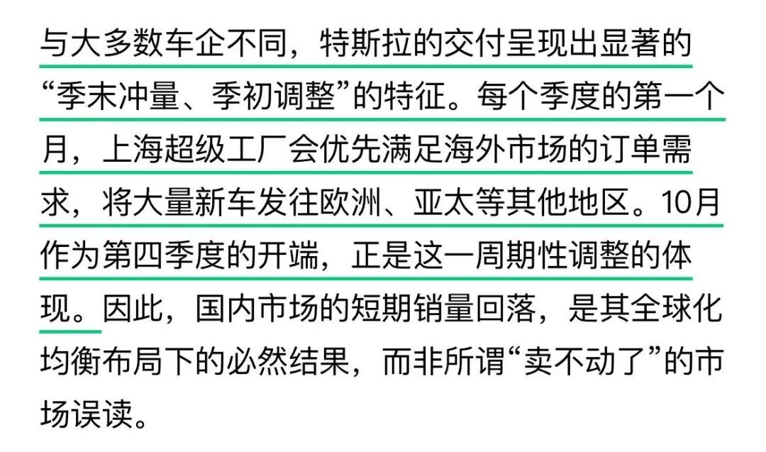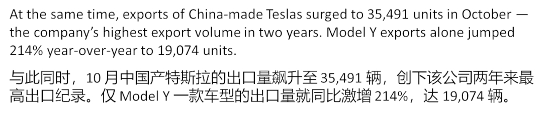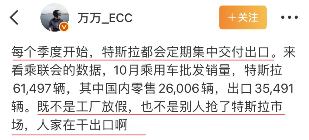 特斯拉上海超级工厂10月出口量创近两年新高,超过3.5万辆,占当月总交付量的57.7%。海外媒体TeslaNorth在报道中提到,其中,仅Model Y这一款车型的出口量就同比猛增214%。博主万万_ECC 观察特斯拉国内交付量变化规律后发现,正如马斯克此前所说,特斯拉每季度初集中安排出口车辆交付。每个季度的第一个月,特斯拉上海超级工厂生产制造的大量新车发往欧洲、亚太等其他地区,这也直接反映出特斯拉在全球市场的持续热销。在特斯拉上海超级工厂的产品远销海外的过程中,中国制造车型的超高品质也收获海外车主的点赞。韩国、欧洲等国家和地区的车主提车后纷纷表示:“上海超级工厂生产的Model Y是我见过所有车里做工最好的!”