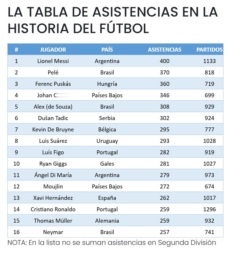 ⚠️梅西400次助攻历史第一有争议?近日,美职联官方在X上发布了一个帖子,称梅西正接近助攻历史第一人普斯卡什的404次记录。然而,该帖子很快被众多网友指出存在统计错误,随后也被标记补充说明:普斯卡什的404次助攻是基于历史估算数据,因为正式助攻统计始于上世纪90年代,而梅西的400次助攻则是在现代足球中,按Opta标准记录下的最高数据。(图1)针对相关争议,阿根廷媒体《elgrafico》专门向足球历史数据专家戴维·桑切斯求证。桑切斯明确表示,普斯卡什的404次助攻实际上是估算值,经过核实,其真实助攻数只有360次。(图2)另外,在美职联发布的这条推文中,只有梅西的数据是按照Opta标准来统计,其他人都是非Opta标准,若采用非Opta标准来统计,梅西的助攻数应为479次,甚至部分数据统计机构显示梅西的助攻数高达505次。🔝足坛历史助攻榜(以Opta的统计标准,不包含乙级联赛数据):1️⃣ 400次 梅西(1133场)2️⃣ 370次 贝利(818场)3️⃣ 360次 普斯卡什(719场)4️⃣ 346次 克鲁伊夫(699场)5️⃣ 308次 亚历克斯·德索萨(929场)6️⃣ 302次 杜尚·塔迪奇(924场)7️⃣ 295次 德布劳内(777场)8️⃣ 293次 苏亚雷斯(1028场)9️⃣ 282次 菲戈(919场)🔟 281次 吉格斯(1027场)即便有争议,那也只是暂时的,4次助攻的差距,相信梅西很快就会成为毫无争议的助攻历史第一人。