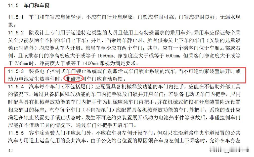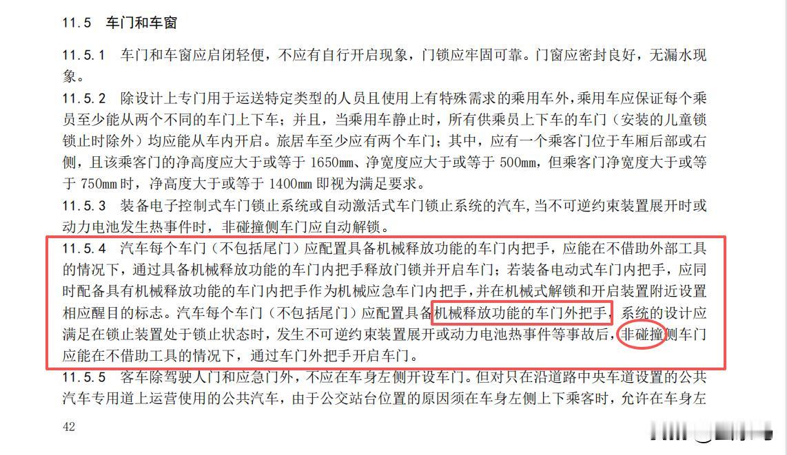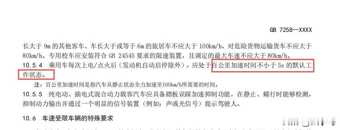 公安部起草的国标《机动车运行安全技术条件》征求意见稿看了,个人非常支持这一国家标准的实行。但那些以此来带小米节奏的还是省省吧!就几个关注点简单解读一下。 10.5.4 乘用车每次上电/点火后(发动机自动启停除外),应处于百公里加速时间不小于 5s 的默认工作状态。 注:百公里加速时间是指汽车从静止状态全力加速至100km/h所需要的时间。 这一条关键点有两个,一个是启动后百公里加速时间不小于5s,另一个是默认工作状态下。我理解以后车子启动,必须强制开启限制动力模式,比如“标准模式”,要切换高性能模式,只能每次都要切换一下。 非常欢迎这一条,对于新手误操作有限制作用。 但,此条并非一刀切,完全限制家用车的性能,只是关注启动时的默认状态下现在动力。 11.5.3和11.5.4大家看图好好读一下,太长了,我就不打字了。 很多人带节奏说也是针对之前的小米事故,麻烦,看清楚文字好吗?公安部也说了,11.5.3自动解锁是非碰撞场景,11.5.4也是非碰撞场景侧车门应能在不借助工具的情况下,通过车门外把手开启车门。 并没有强制碰撞后也能开启,因为碰撞后的不可控因素太多了,特别是高速碰撞下,结构变形,无法开启车门再正常不过来,这个时候只能切割破坏救援。