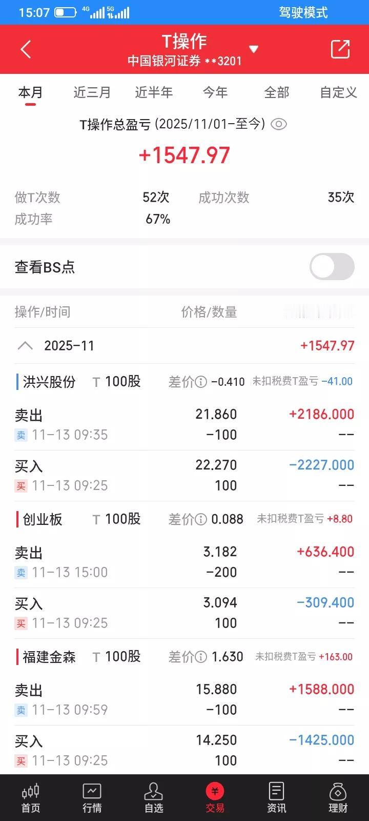 2025.11.13,今天t了100股洪兴股份,亏了41块,t了100股创业板,赚8.8元,t了100股福建金森,赚163元,t了100股远达环保,亏了29元,t了100股三变科技,赚35元,今天一共t了500股,3只赚钱,2只亏损,盈亏相抵总的做t赚136元元。今天做t卖出的股票成交额是6787元,印花税是3.4元,佣金1块多钱,今天做t净赚131元,又相当于做了一天日结,进一步降低了持股成本,降低风险。
