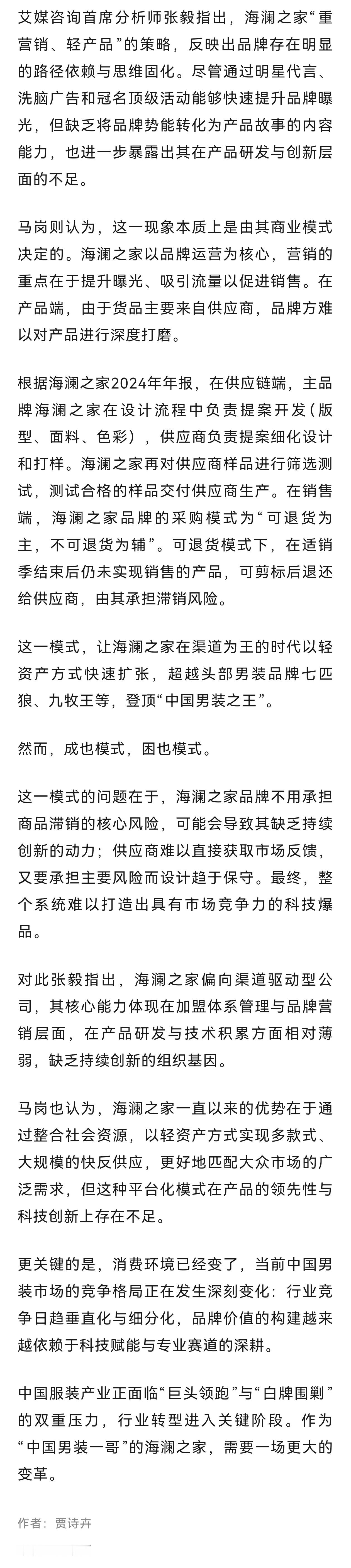 近日,海澜之家被国际指数编制公司MSCI公司“除名”,MSCI指数是全球投资经理的重要参考基准。一家公司被纳入MSCI中国指数,通常意味着它将吸引大量国际资金的关注和配置;反之,被剔除则可能影响其市场流动性与资本关注度。海澜之家被剔除MSCI中国指数,或源自其近年来持续下滑的业绩表现。印象中,关于海澜之家品牌的营销争议,还是其剪掉吊牌后降价去库存的做法。长久以来,海澜之家对外一直宣传“一年四季不打折”,但对于卖不掉的过季库存,品牌会采取剪标处理,即剪掉带有“海澜之家”商标的吊牌后,将商品退回给供应商,再由供应商以1到3折的低价,在拼多多等电商平台销售。如此操作,不仅能保护品牌溢价下的价格体系,还能避免影响线下门店、官方线上渠道的正价商品销售,同时达到快速清理库存目的。尽管是“一石三鸟”的“聪明”做法,但长久以往消耗的是品牌声誉。从网友对海澜之家的评价来看,大多数吐槽的,其中不乏曾经粘度高的老顾客,主要集中在:价格高、品控差、剪标货、营销过度等。